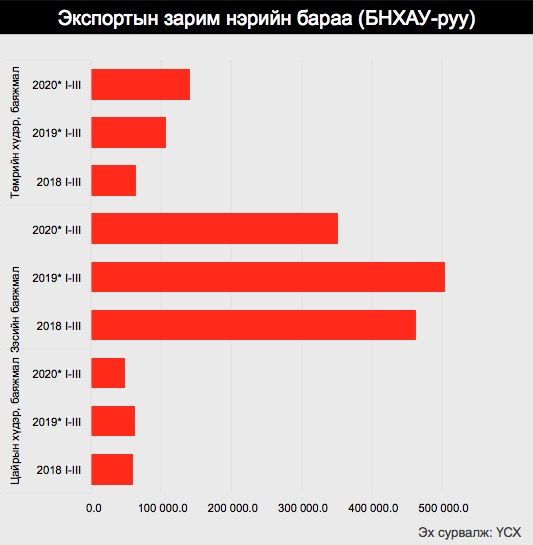 Экспорт өмнөх оны мөн үеэс 735.9 сая америк доллароор буурахад алтны экспорт 115.6 сая америк доллар, зэсийн баяжмалын экспорт 152.6 сая америк доллар, нүүрсний экспорт 391.3 сая америк доллароор тус тус буурсантай холбогдож байна.