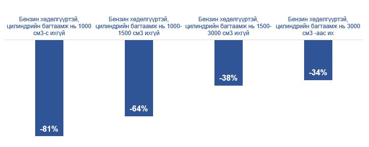 2020 оны дөрөвдүгээр сарын статистик харвал жижиг мотортой автомашины импорт бараг үгүй болсон байхад том мотортой машины импортын уналт хамгийн бага. Энэхүү тренд нь тавилга, орон сууц гэх мэт ялгаатай бүхий л бүтээгдэхүүн дээр ажиглагдана.