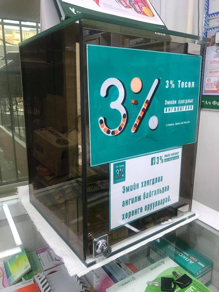 Азийн сан, Каритас Чех Репаблик олон улсын байгууллагуудын хамтарсан 3R буюу хог хаягдлыг багасгах, дахин ашиглах, дахин боловсруулах төслийн уралдаанд шалгаран, сайн дурын залуусын оролцоотойгоор “3 % эмийн хаягдлыг ангилцгаая” төсөл Монгол Улсад хэрэгжиж эхэлсэн байна. Уг төслийн зорилго иргэдэд хог хаягдлыг ангилан ялгах дадал бий болгох, ялангуяа аюултай хог хаягдлын талаар мэдлэг мэдээллийг олон нийтэд хүргэж, эмийн зөв зохистой хэрэглээг сурталчилснаар хүрээлэн буй орчинд нөлөөлөх эмийн хаягдлын сөрөг нөлөөллийг бууруулах.