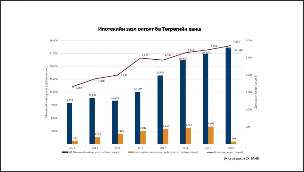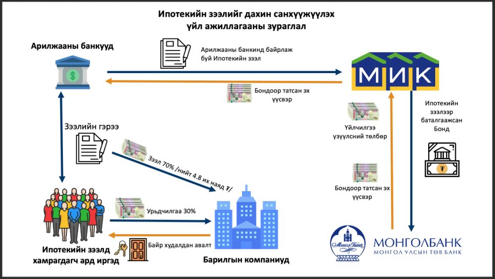 МУ-ын орон сууцны зээлийн багц эдүгээ бараг 5 их наяд төгрөг болсны 2.8-ийг МБ, 2.1 нь арилжааны банкууд, 300 тэрбумыг нь ЗГ гаргажээ. Арилжааны банкуудын зээлийг барьцаалан хөрөнгийн зах зээл дээр бонд босгохыг Монголын Ипотекийн Корпороци (МИК) хариуцдаг.