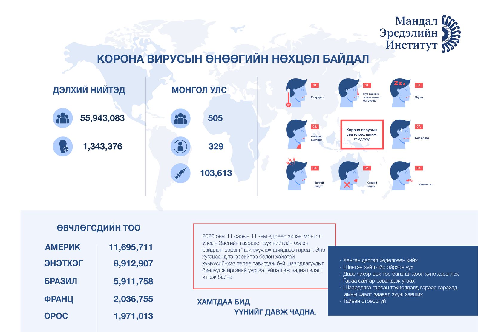 Манай улсын хувьд эхний тохиолдол гуравдугаар сард анх зөөврийн тохиолдлоор илэрч, 11 дүгээр сарын 11-ийг хүртэл дотооддоо халдвар алдаагүй байсан билээ. Үүссэн нөхцөл байдалтай холбоотойгоор Монгол Улсын Засгийн Газраас “Гамшгаас хамгаалах бүх нийтийн өндөржүүлсэн бэлэн байдал”-д шилжүүлж 12 дугаар сарын 1 хүртэл хатуу дэглэмтэй хөл хориог тогтоосон. Энэ нь иргэдийн дунд тодорхой хэмжээний эсэргүүцэлтэй тулгарч байгаа. Нууцаар хот хооронд зорчих, хөл хорион дэглэмийг зөрчих зэрэг зөрчлүүд өдөр бүр илэрсээр. Гэхдээ цар тахлын дэгдэлтийн эхэн үед л хөл хорион чанга дэглэмийг сахих нь уг тахлыг таслан зогсооход хамгийн чухал ач холбогдолтой юм.