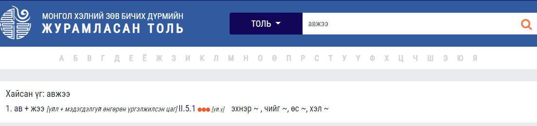 Тэгвэл бас нэг өөр үгээр жишээ татъя. Журамласан толь бичгээс "авчээ" гэдэг үгийг толиос хайж үзье.