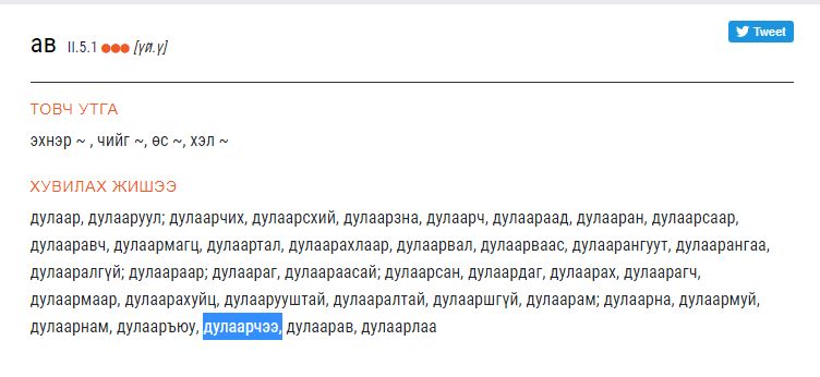 Өөрөөр хэлбэл, "Авчээ" гэдэг үгийг толиос зөв хувирснаар нь хайх бус "Ав" гэсэн үйл үгийн үндсээр нь хайх нь зөв. Ингээд хайсан үг дээрээ дарж орвол дараах байдлаар зөв хувирсан хэлбэрийг жишээ үгээр оруулсан байна.