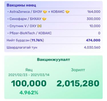 Манай улсын хувьд ч ийм боломжууд 2020 оны эхээр байсан бөгөөд дан доноруудаас хараат байдлаар вакцинаа хангаж байгаа нь УОК-ын бас нэгэн алдаа юм. Энэ асуудалд ГХЯ болон ЭСЯамдууд муу ажиллажээ. Вакцины хангалт 2021 оны сүүл хүртэл аль ч улсуудад том сорилт хэвээр байгаа бөгөөд дээр хэлсэнчлэн вакцин үйлдвэрлэгчид эхний ээлжинд 2020 онд гэрээ хийсэн улсуудын вакциныг нийлүүлэхээр ажиллаж байна. COVAX хөтөлбөрийн хүрээнд 330 сая тунг Oxford/AstraZeneca ба Pfizer/BioNTech компаниас авч, 145 орны хүн амын 3.3% хувийг 2021 оны зургадугаар сарын байдлаар вакцинжуулах төлөвлөгөөтэй тул манай улсын хүн амын 3 хувийг л хангах вакцин өгөхөөр байгаа бөгөөд вакцины хангалтыг нэмэгдүүлэх чиглэлд улам эрчимтэй ажиллах шаардлагатай байна.