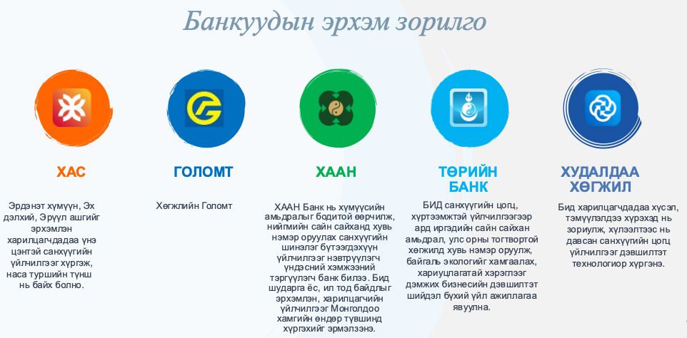 Энэ удаагийн топ 5 банк танилцуулах цуврал ч гэсэн тус сэдэвтэй уялдах болно. Амьдралд ашид хамтдаа, Сайн сайхныг санхүүжүүлнэ, Танд ойрхон түмэнд итгэлтэй гэх мэтээр банкуудын уриа үгийг л илүүтэй сонсож байсан болохоос биш алсын хараа, эрхэм зорилгыг нь төдийлөн сонсоогүй биз ээ. Эзэн Богд Чингис хаан хүртэл “Холын зорилго үгүй хүнд ойрын зовлон мундахгүй” гэж хэлсэн байдаг. Өөрөөр хэлбэл алсын хараа, эрхэм зорилго, түүндээ зориулсан стратегиа боловсруулж чадаагүй компани бол өдөр тутмын гал унтраах арга хэмжээтэйгээ зууралдсаар хөгжих, томрох, дэвших боломжуудаа алдсаар байдаг.