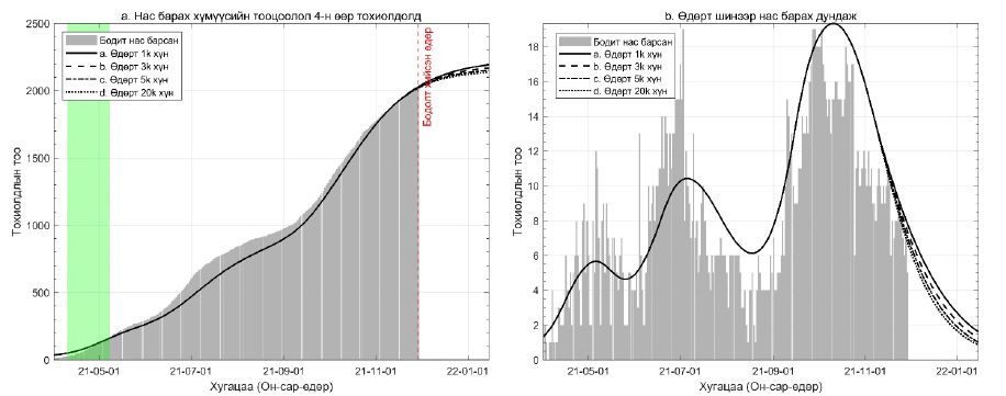 - Манай судалгааны багийн Монголд хийж байгаа ажил нууц үеийн хугацаа, нас баралтын зэрэг, вакцины үр нөлөө гэх зэрэг мэдээлэл дээр үндэслэн ирээдүйн таамаглал прогноз хийдэг. Тэдгээр тулгуур параметрүүд дэлхий нийтээр тодорхой болоогүй байна. Иймд яг энэ асуултад одоогоор тодорхой хариулт өгч чадахгүй нь.