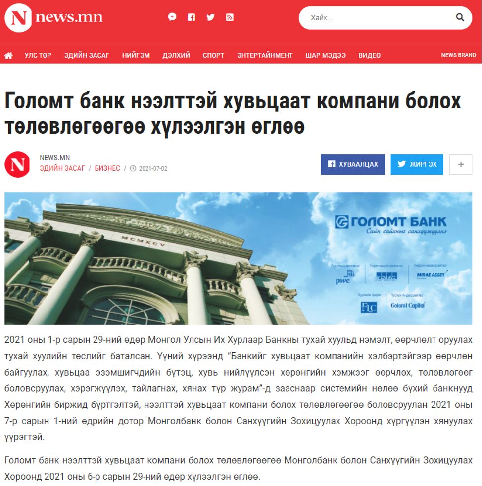 Тэгвэл 2021 оны 7-р сарын 2-ны өдөр Голомт банк төлөвлөгөөгөө мөн адил Санхүүгийн зохицуулах хороо болон Монголбанканд хүргэсэн тухайгаа news.mn –ээр дамжуулан хүргэжээ.