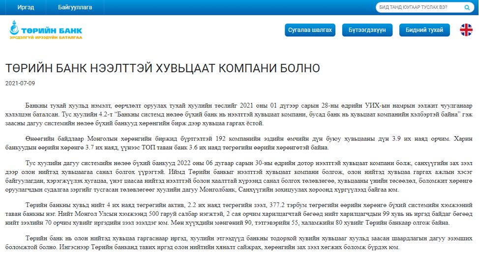 Мөн 2021 оны 7-р сарын 9-ны өдөр Төрийн банк мөн ижил утгатай мэдээллийг өөрийн сайтаар дамжуулан олон нийтэд хүргэсэн байдаг.