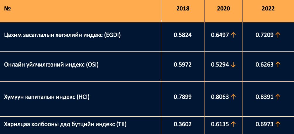 2022 онд гарсан энэхүү судалгаагаар дээрх Цахим засаглалын хөгжлийн индексээр Монгол улс хэрхэн үнэлэгдсэнийг 3-н үзүүлэлт тус бүрээр сүүлийн 2 судалгаатай харьцуулж харвал индекс тус бүр дээр 2022 онд огцом өсөлт үзүүлсэн байна:
