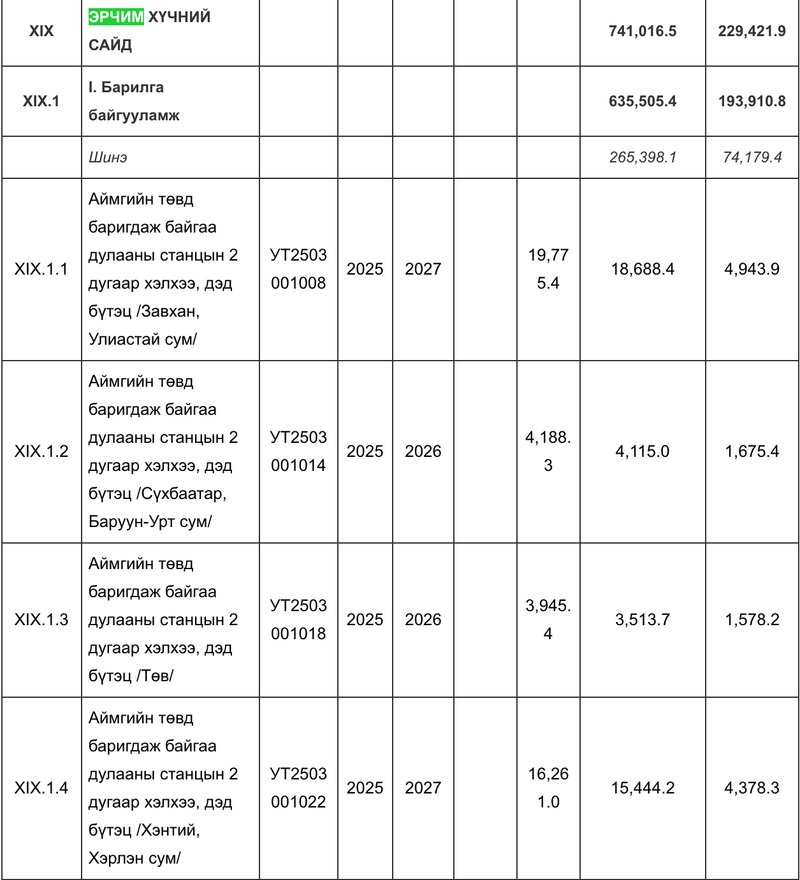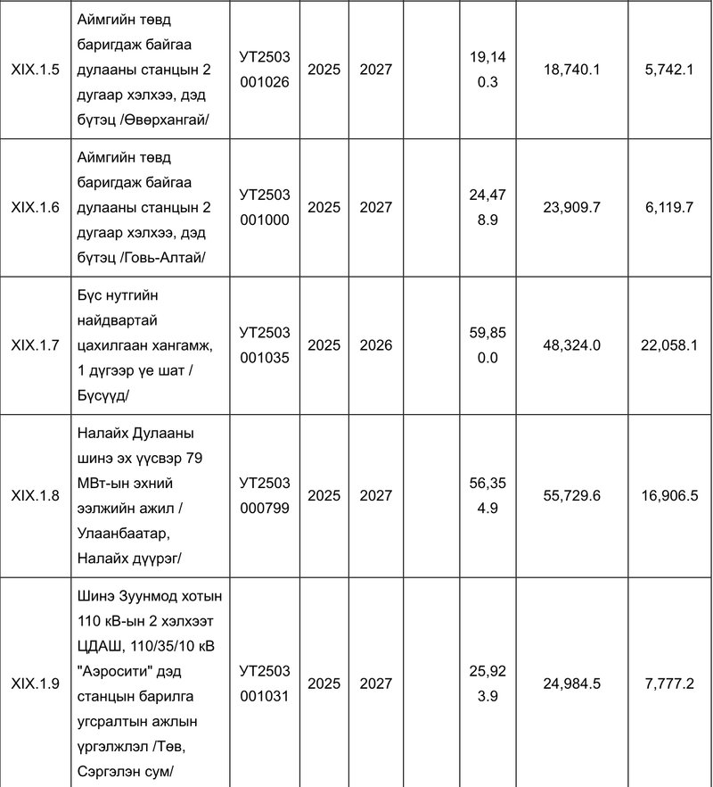 Тодруулбал 2025 онд шинээр эрчим хүчний дулааны станц барихаар дээрх төсвөөс ₮74 орчим тэрбумыг зарцуулахаар төлөвлөсөн. Тухайлбал Завхан аймгийн Улиастай, Сүхбаатар аймгийн Баруун-Урт, Хэнтий аймгийн Хэрлэн, Төв аймгийн Сэргэлэн, Баянхонгор аймгийн Баянхонгор сум, Төв, Өвөрхангай, Говь-Алтай аймаг (хот болон сумын нэр дурдаагүй), Улаанбаатар хотын Налайх дүүрэгт эрчим хүчний дэд бүтцийн ажил хийхээр төлөвлөжээ. Дээрх хүснэгтийг төсвийн тухай хуулийн хавсралтаас харах боломжтой.