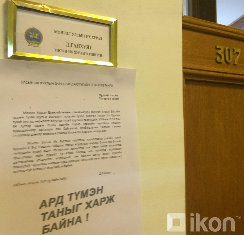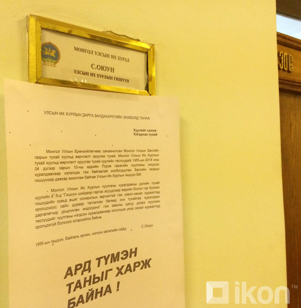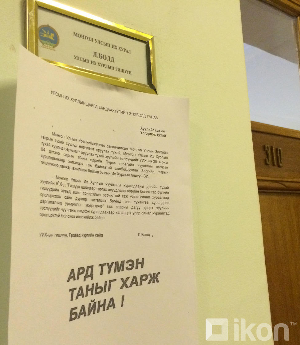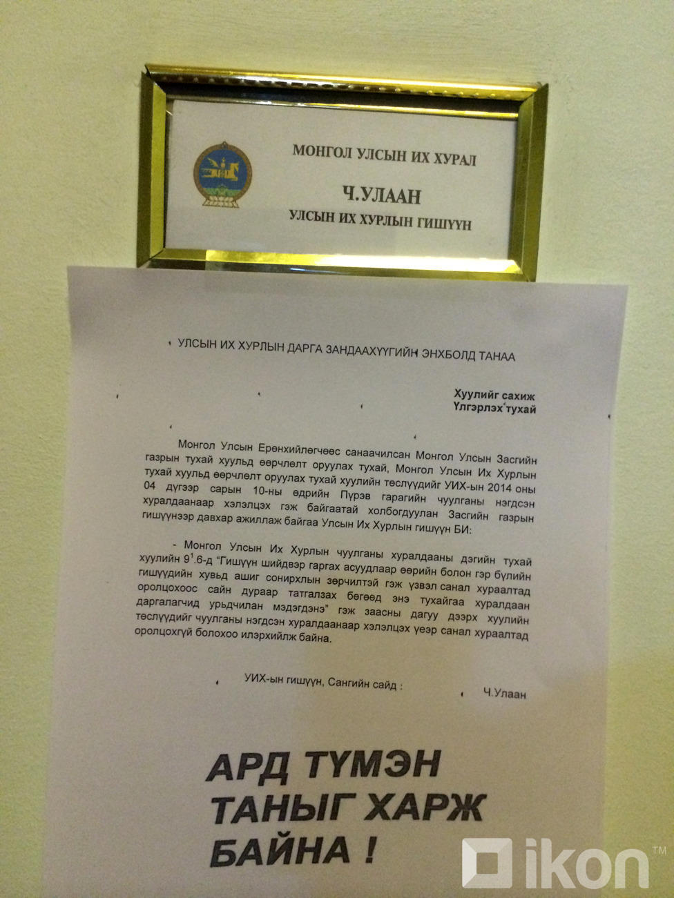 Өнөөдөр "давхар дээл"-тэй гишүүдийн өрөөний үүдэнд дараах бичгийг наасан байна. Уг бичгийг чухам хэн хэвлэж наасан нь одоогоор тодорхойгүй байна.