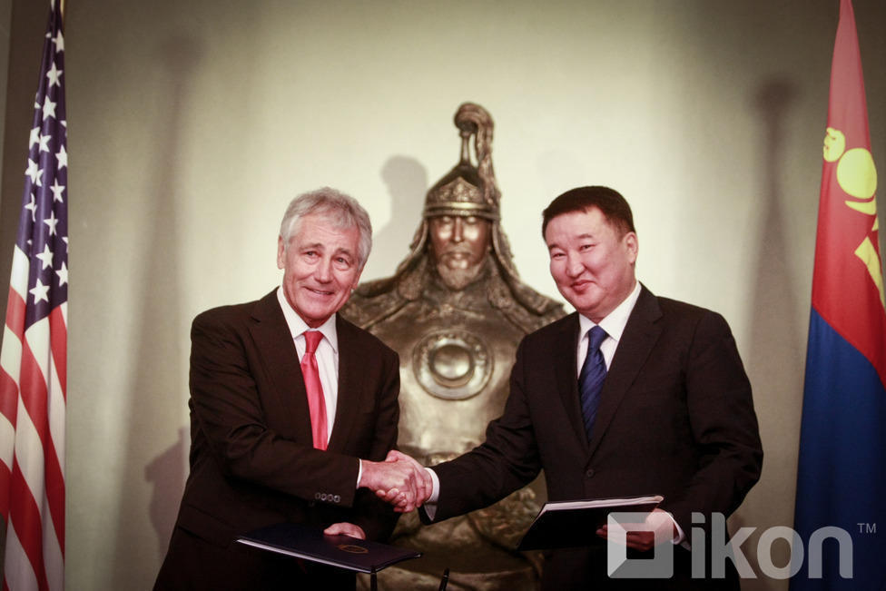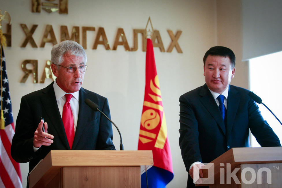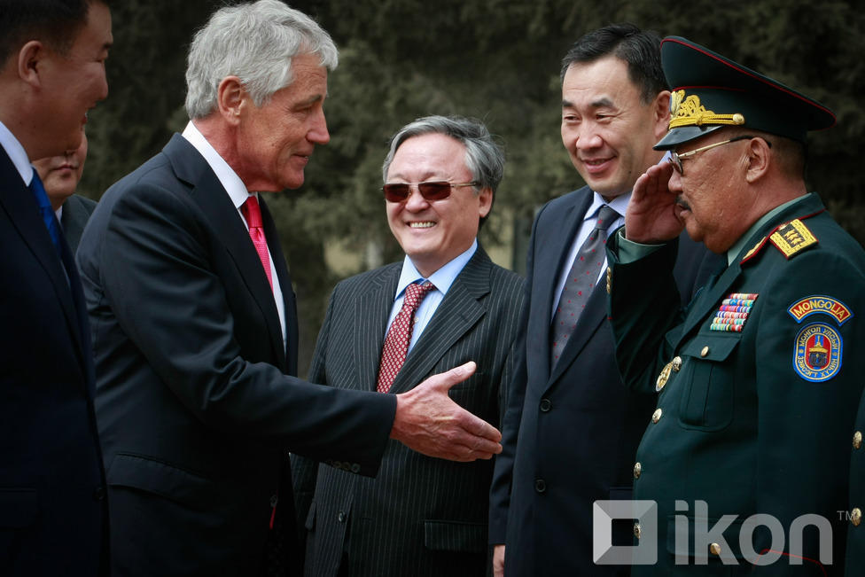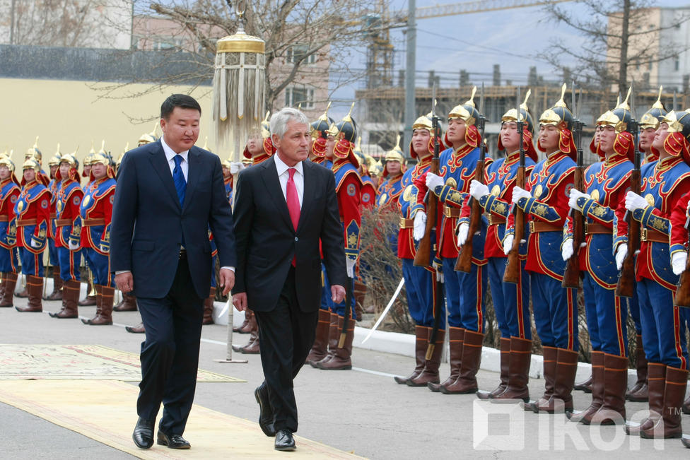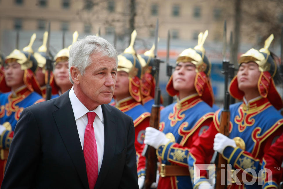 Монгол Улсын Батлан хамгаалахын сайд Д.Бат-Эрдэнэ АНУ-ын Батлан хамгаалахын сайд, ноён Чак Хейгелийг хүндэт харуулын хамт Монгол Улсын БХЯ-нд хүндэтгэн угтан авч, Монгол оронд айлчлан саатсанд талархлаа илэрхийлсний дараа албан ёсны хэлэлцээ эхэлж, хоёр орны харилцаа, түүний дотор батлан хамгаалах салбарын харилцаа, хамтын ажиллагаа, түүний цаашдын төлөвийн талаар харилцан санал солилцлоо.
