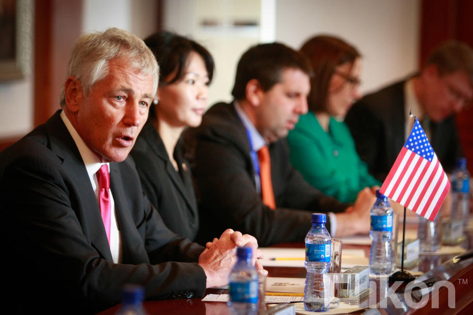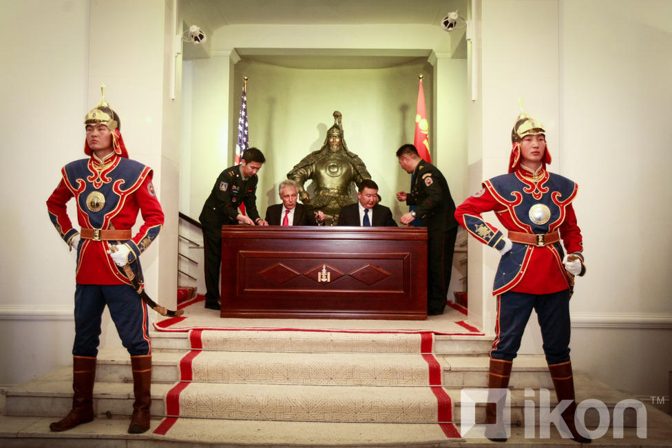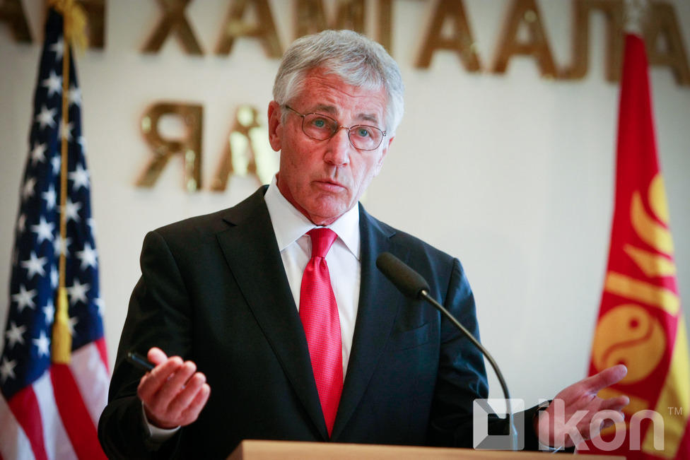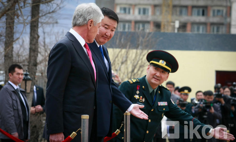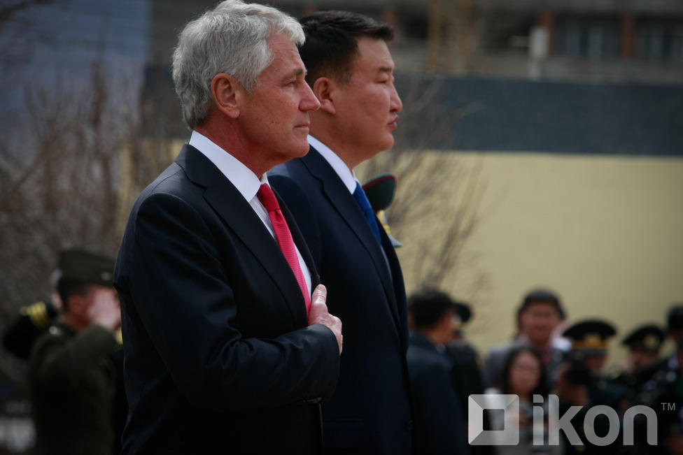 Монгол Улсын Батлан хамгаалахын сайд Д.Бат-Эрдэнэ АНУ-ын Батлан хамгаалахын сайд, ноён Чак Хейгелийг хүндэт харуулын хамт Монгол Улсын БХЯ-нд хүндэтгэн угтан авч, Монгол оронд айлчлан саатсанд талархлаа илэрхийлсний дараа албан ёсны хэлэлцээ эхэлж, хоёр орны харилцаа, түүний дотор батлан хамгаалах салбарын харилцаа, хамтын ажиллагаа, түүний цаашдын төлөвийн талаар харилцан санал солилцлоо.