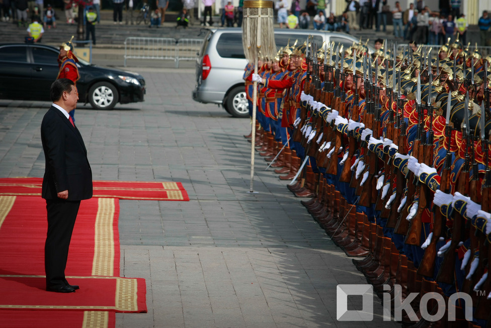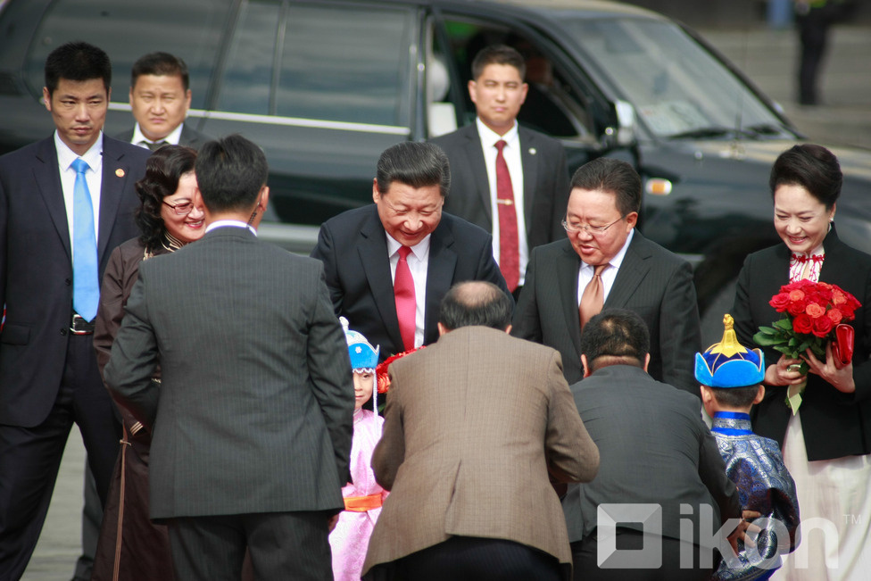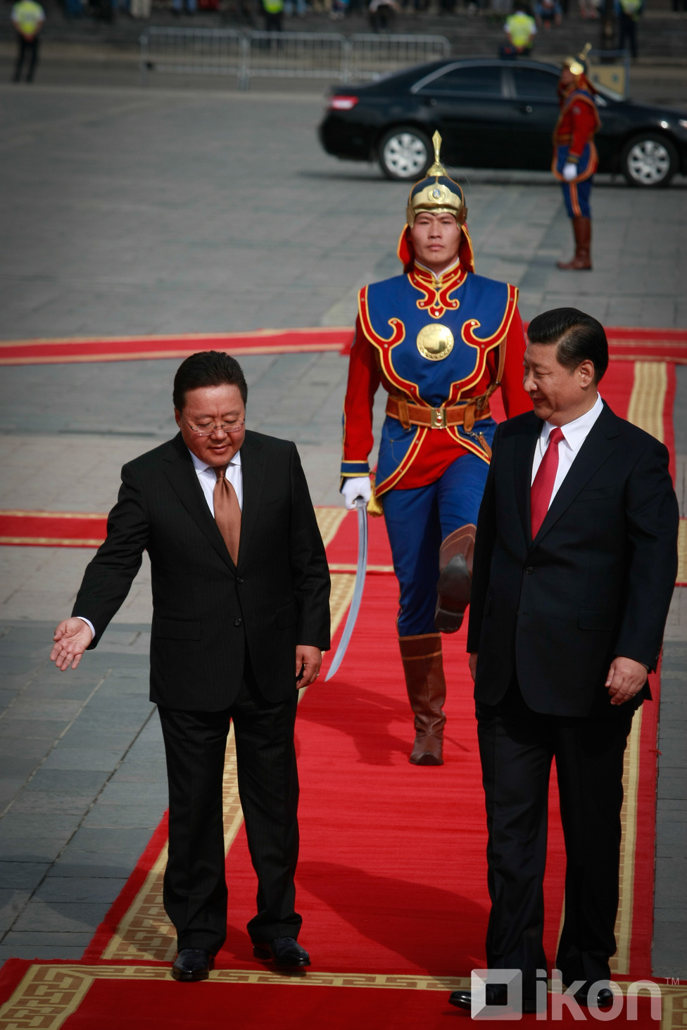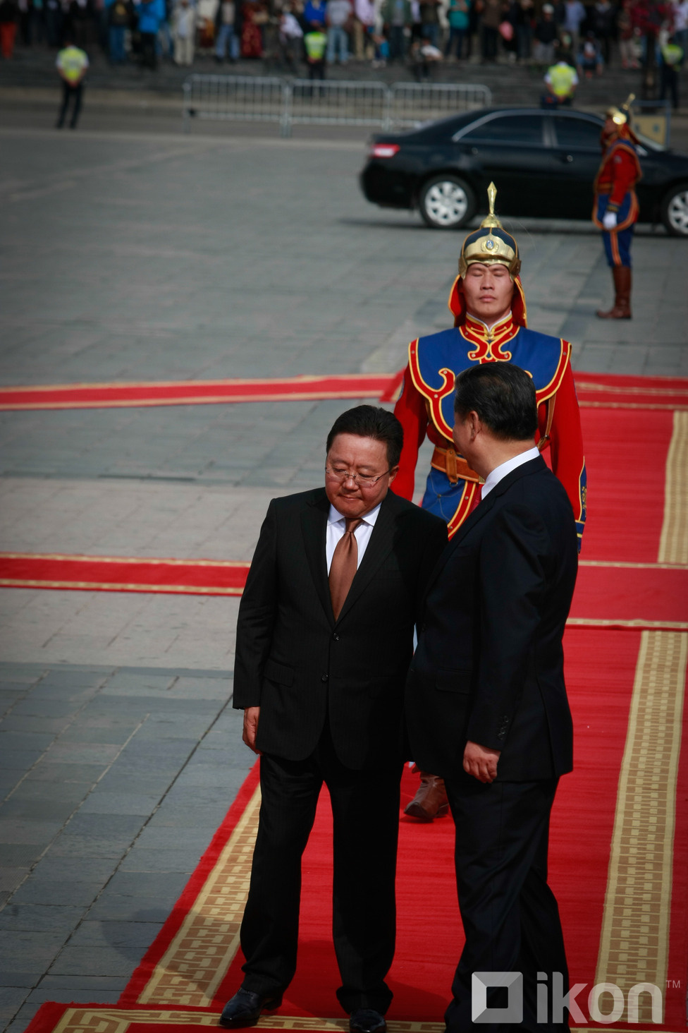 Монгол Улсын Ерөнхийлөгч Ц.Элбэгдорж, тэргүүн хатагтай Х.Болормаа нар Бүгд Найрамдах Хятад Ард Улсын Дарга Си Зиньпин, гэргий Пөн Ли-Юань нарыг Чингисийн талбайд албан ёсоор угтах ёслол боллоо.
