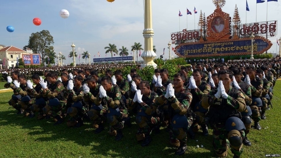 Камбожийн хаан титмээ зүүсний 10 жилийн ойн ёслолын өдөр цэргүүд Пном Пен ордны өмнө залбирч байна. 2014.10.19