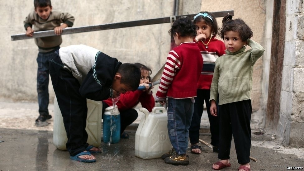 Сири хүүхдүүд шавхуургаар ус ууж байна. Сирийн нийслэл Дамаскусын захад байрлах Доума. 2014.10.29