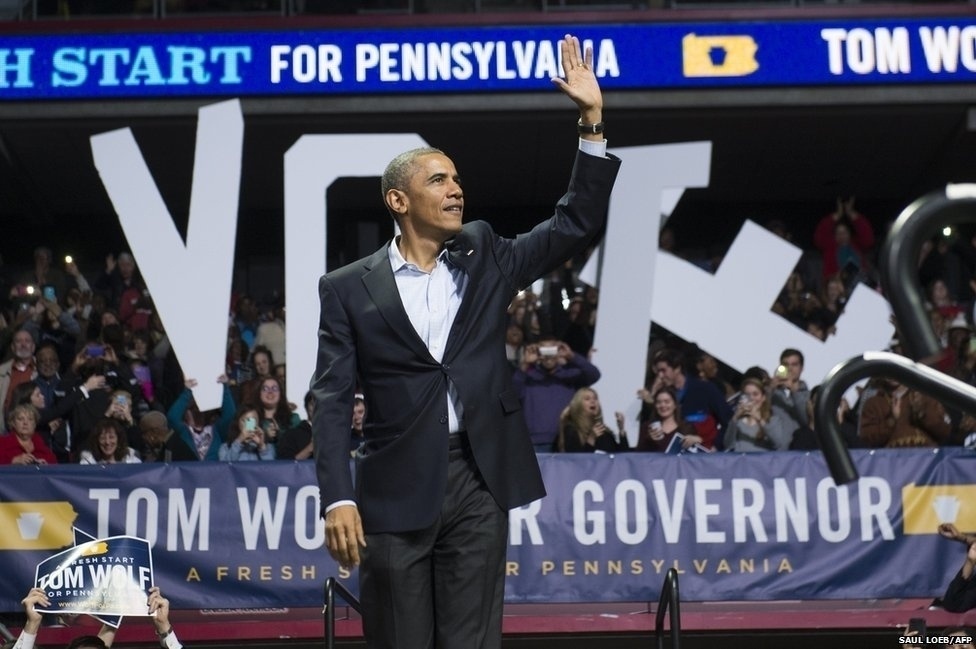 АНУ-ын Ерөнхийлөгч Барак Обама Ардчилсан намаас Пеннсилванийн амбан захирагчид нэр дэвшиж буй Том Вольфийн кампанит ажлын үеэр илтгэл тавих гэж иржээ. Пиладелфийн Их сургуулийн төв танхимд. 2014.11.03