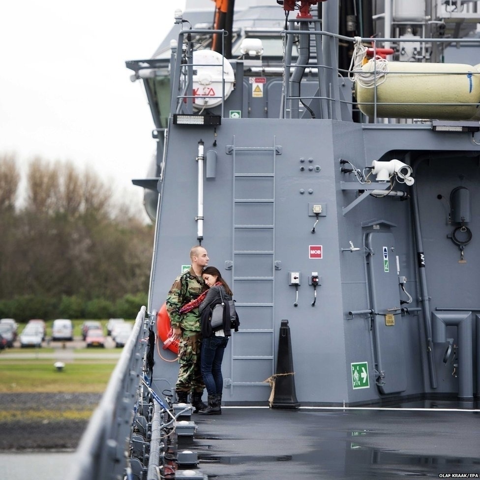 Недерландийн Ден Хелдерийн эрэгт Германийн армийн цэрэг найз бүсгүйдээ “баяртай” гэж хэлж байна. Энэ усан онгоц Баруун Африкт очиж Эбола вирусын эсрэг тэмцэх үүрэгтэй хөдөлж байгаа юм. 2014.11.03