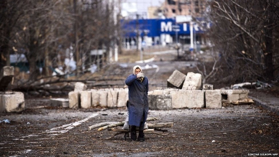 Хагалсан мод чирч яваа настай эмэгтэй Донецкийн онгоцны буудлын хажууханд зогсож байна. Зүүн Украйны салан тусгаарлагчид барууныханд мэдэгдэлгүй хууль бусаар сонгууль хийжээ. 2014.11.03