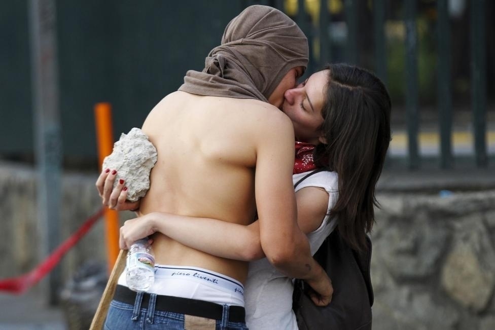 Венесуэлийн Ерөнхийлөгч Николас Мадурогийн засгийг эсэргүүцэгчид Каракас хотод үнсэлцэж буй нь. 2014.03.22