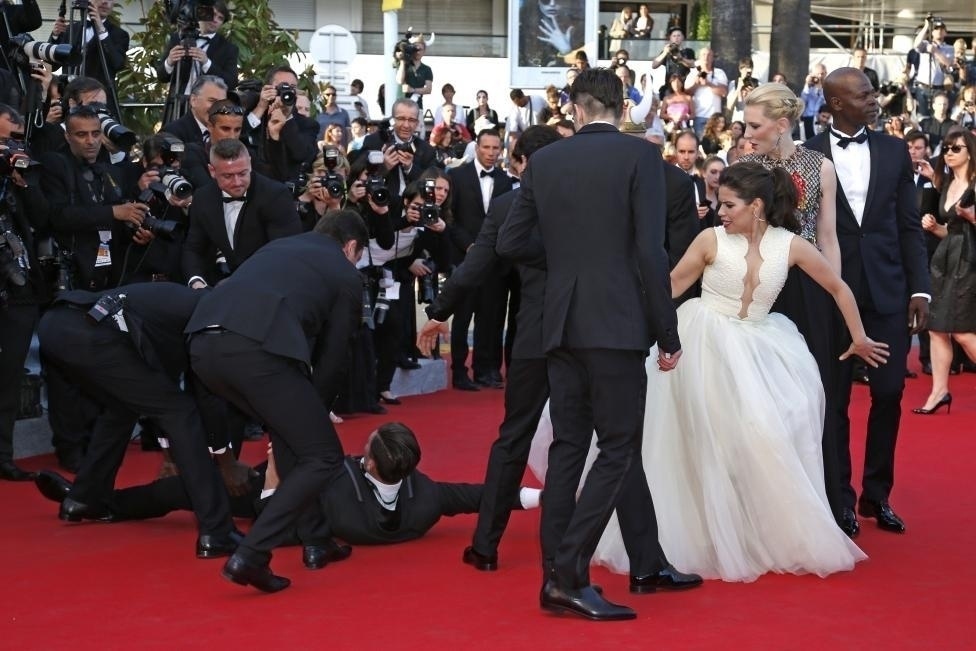 Каннын наадмын үеэр жүжигчин Америка Феррарагийн даашинзны хормойг сөхөх гэж оролдсон залуу хамгаалалтынханд баригдаж буй нь. 2014.05.16