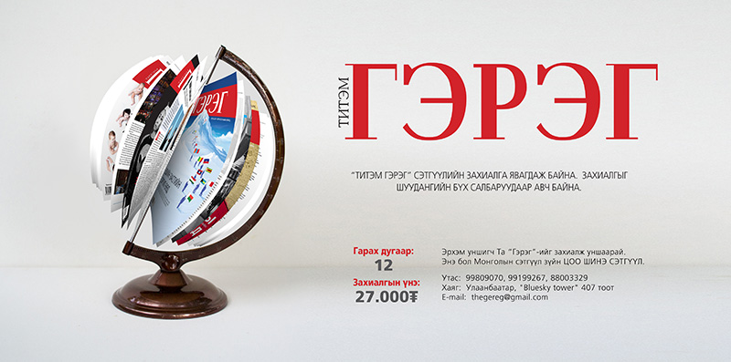 Монголын хэвлэлүүдийн энэ оны III улирлын захиалга эхэлсэн байна. Сонин, сэтгүүл ялгаагүй бүгдээрээ захиалгын рекламаа чадах чинээгээрээ хийж эхэллээ. Энэ “Гэрэг”-т ч хамаатай. Гэхдээ бид захиалгын рекламаа тавиад л өнгөрөхийг хүссэнгүй. Уншигчдад бид юу чаддагаа харуулахыг хүслээ.Тиймээс хоёр долоо хоногийн турш жил гаруйн хугацаанд бэлтгэсэн 61 сэтгүүлээсээ 14 нийтлэл онцлон сонгож, өдөр бүр iKon.mn цахим хуудаснаа дэлгэж байгаа билээ.