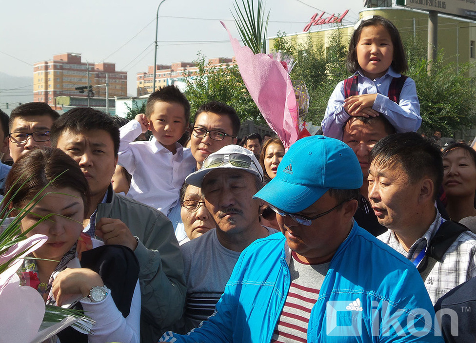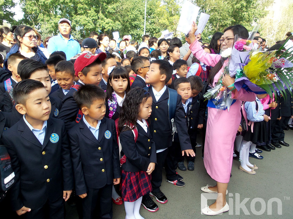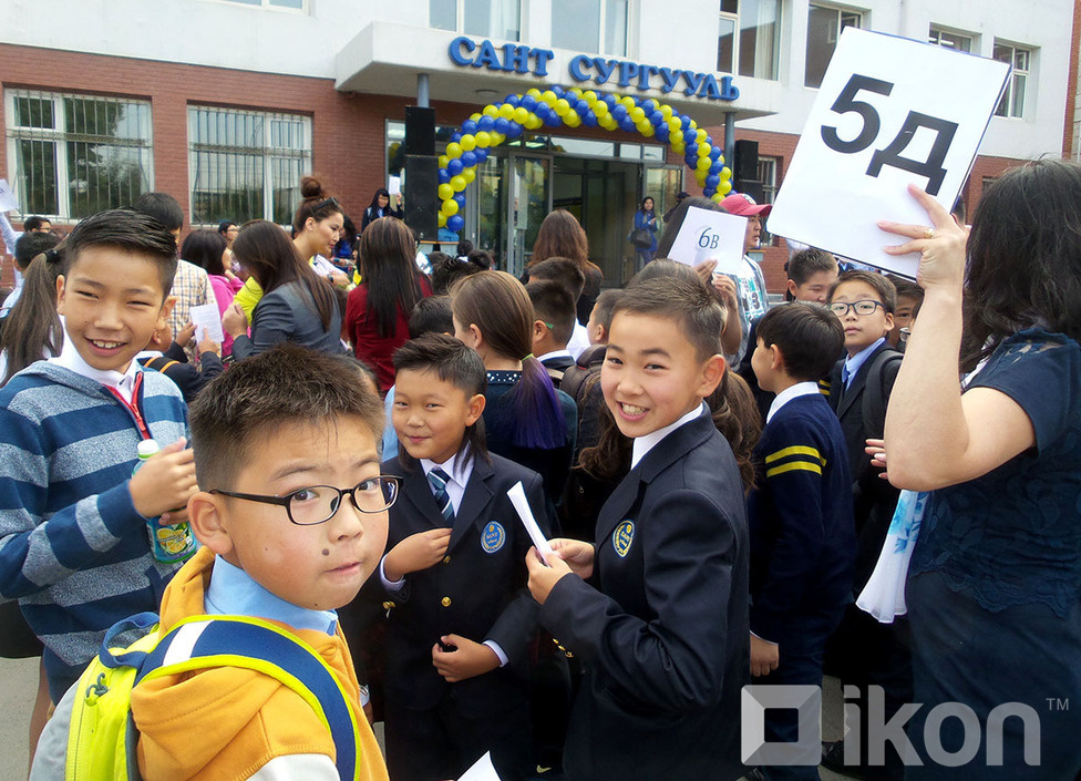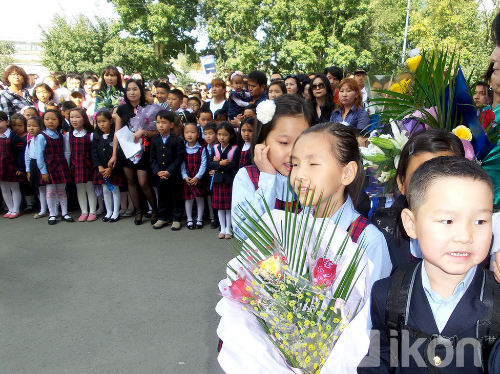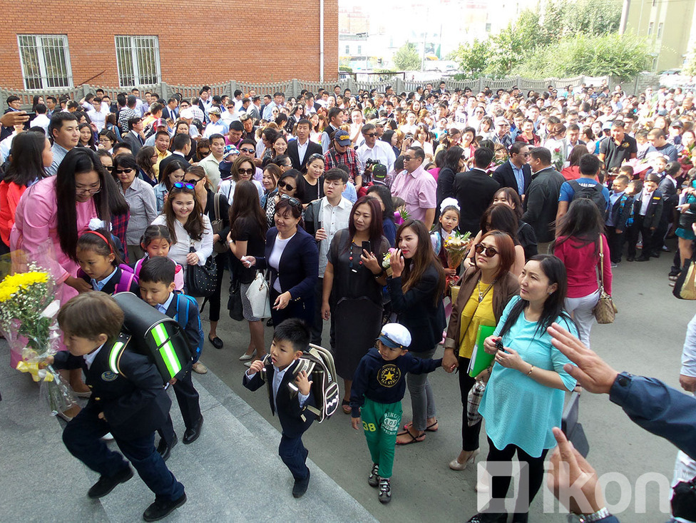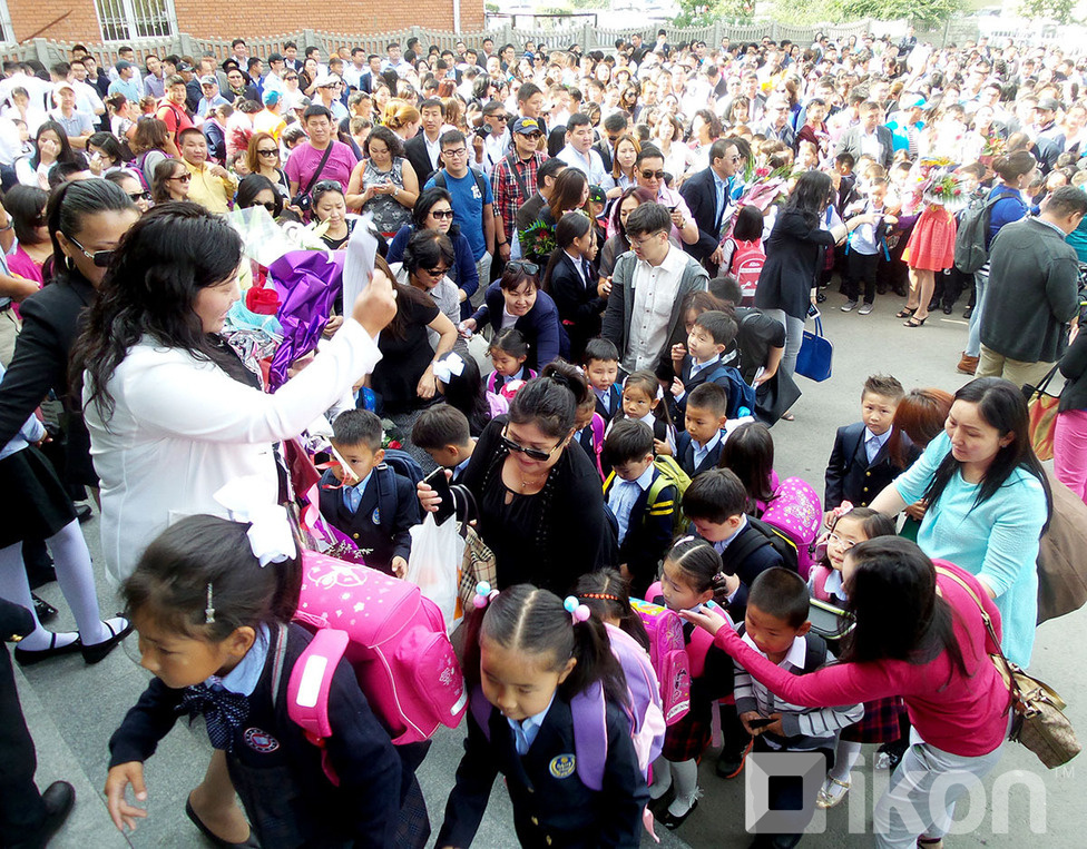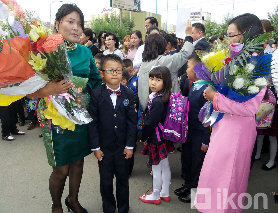 Аав, ээжийнхээ гараас хөтөлж, багшдаа бэлэглэх баглаа цэцгээ тэвэрсэн сурагчид "Сант” сургуулийн гадаах талбайд цуглажээ.