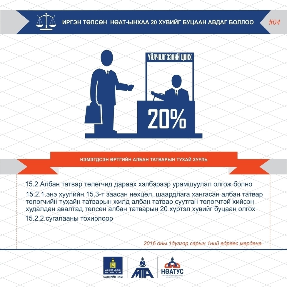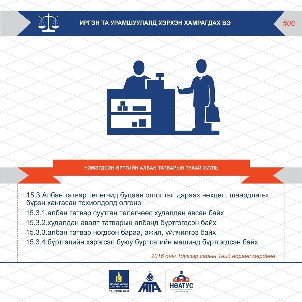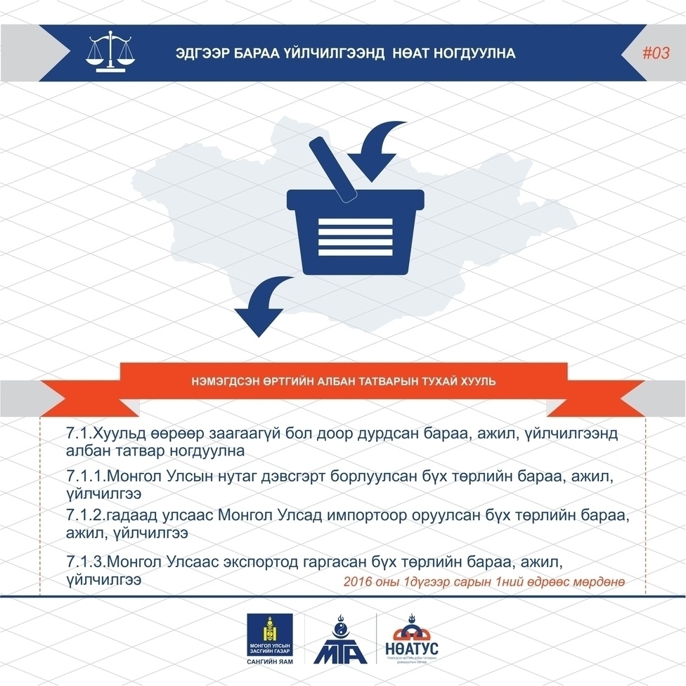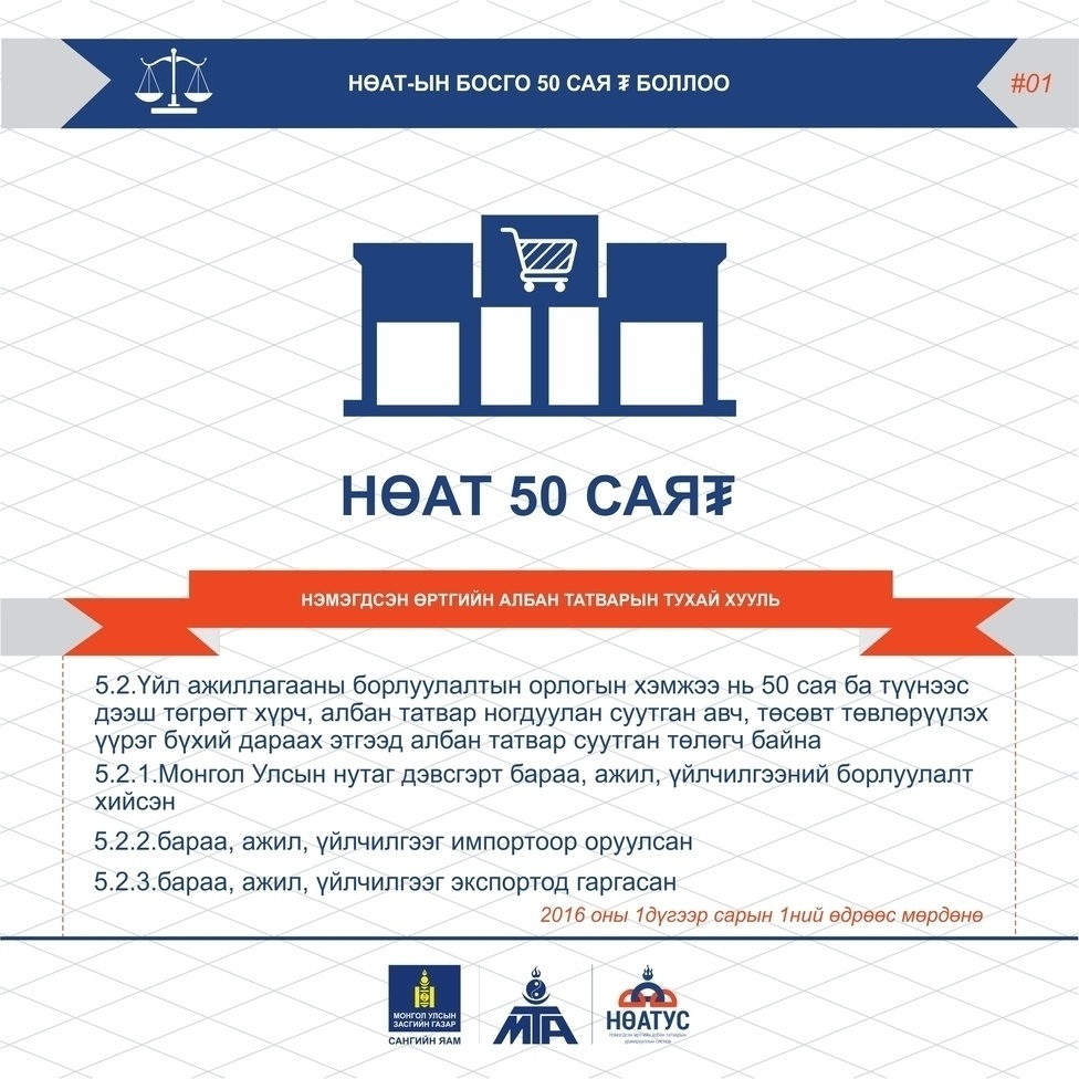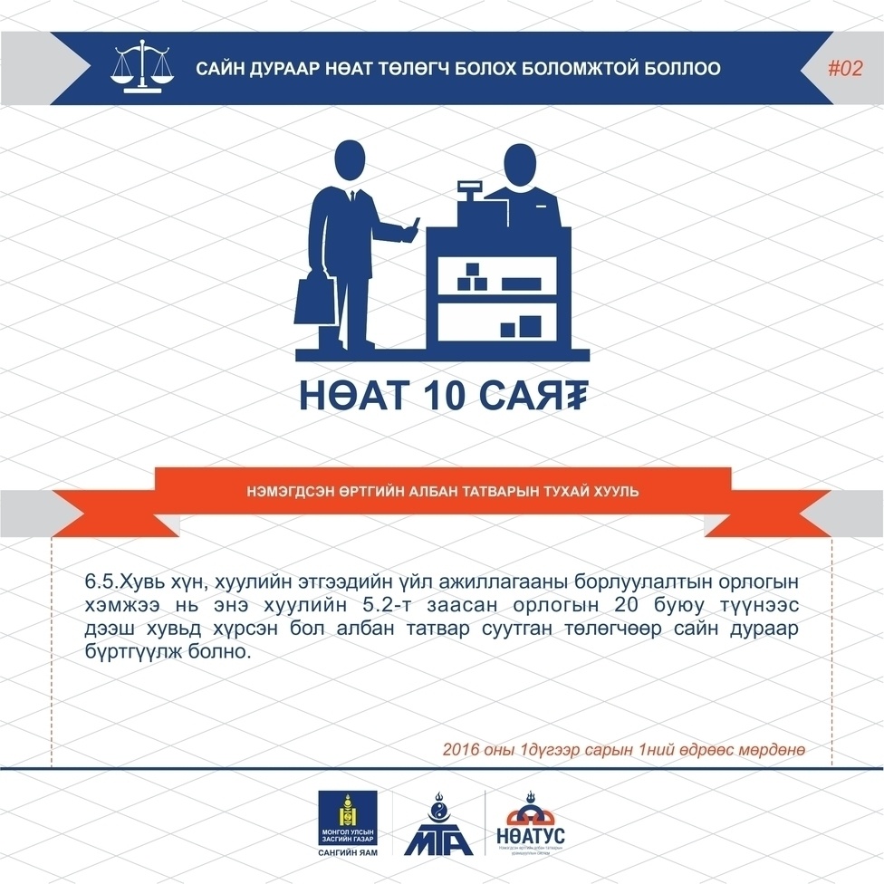 НӨАТ-ын тухай хууль шинэчлэн батлагдсантай холбоотойгоор дараах инфографикийг танд хүргэж байна. Та эндээс хуулийн онцлох заалтуудыг энгийн, ойлгомжтой байдлаар хүлээн авах боломжтой.