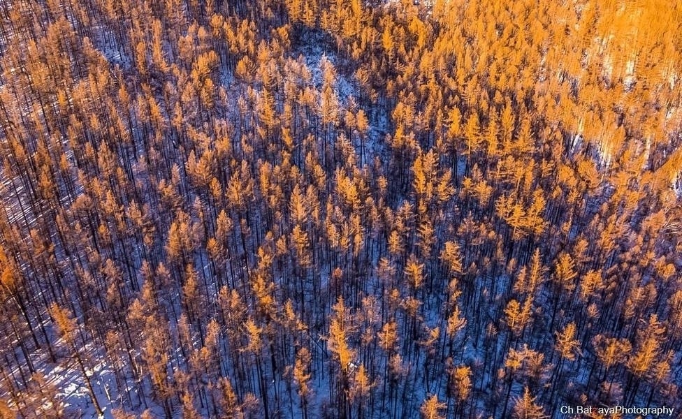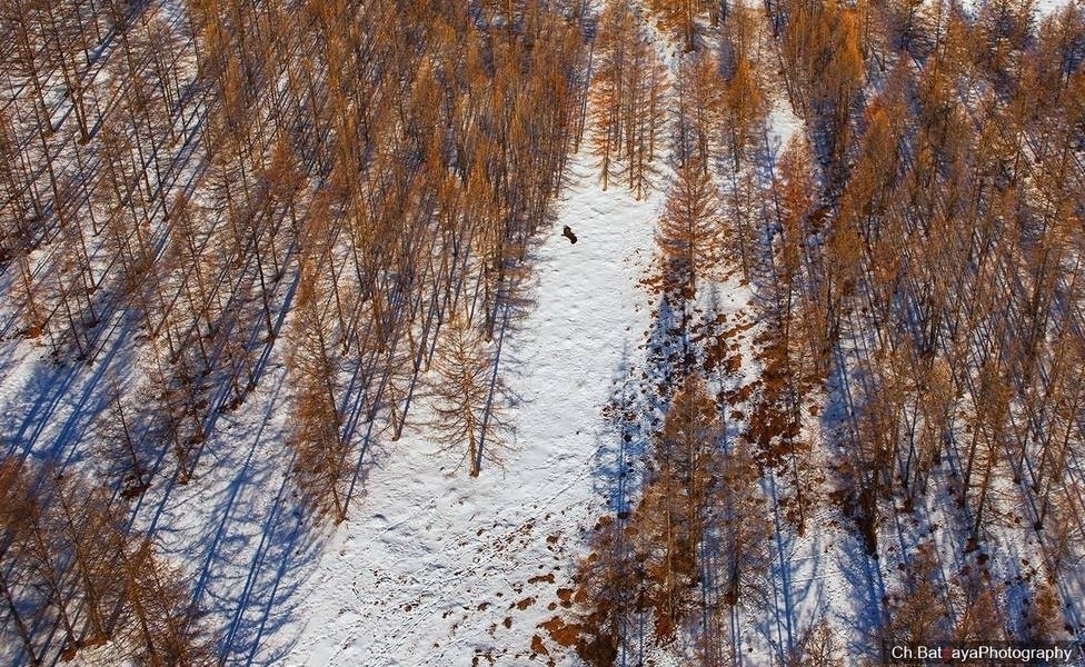 Өвлийн ойн дээгүүр идшээ хайсан бүргэд ниснэ. Хан хэнтийн дархан газар.