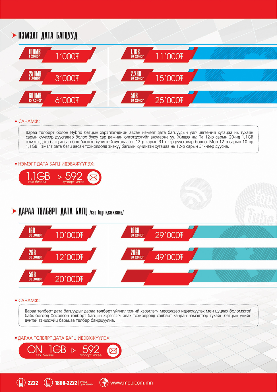 Дараа төлбөрт болон Hybrid багцын хэрэглэгчид дараа төлбөрт дата багцуудыг одоогийн нөхцөлөөр ашиглах боломжтойг дуулгахад таатай байна. Хэрэв та дараа төлбөрт үйлчилгээний хэрэглэгч бол мессэжээр дараа төлбөрт дата багцаа идэвхжүүлээд сар бүр дараах интернэтийн хэрэглээг авах боломжтой.