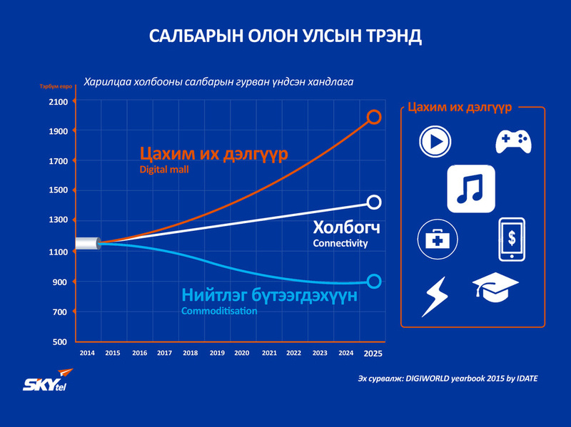 Үүнээс илүү орлого олох боломж нь Digital mall буюу цахим их дэлгүүр. Өндөр хурдтай, өргөн зурвасын үйлчилгээний цаана томоохон контент, аппликейшнүүд гараад ирсэн. Өөрөөр хэлбэл хүнд хэрэгтэй бүх зүйлийг л харилцаа холбооны компаниуд өгөх болчихоод байна.