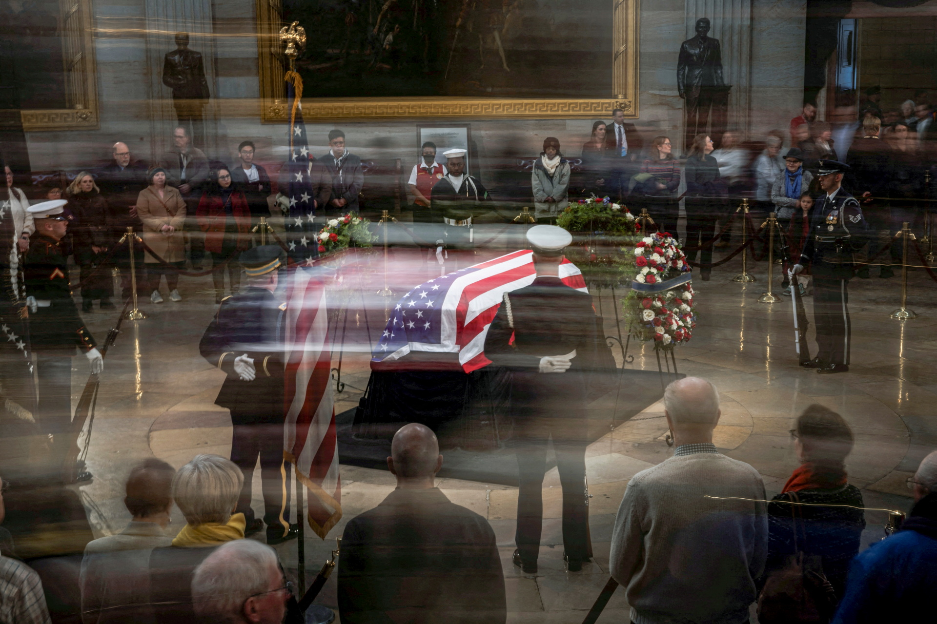 2024 оны 12 сарын 29-нд 100 насандаа таалал төгссөн АНУ-ын ерөнхийлөгч асан Жимми Картерын шарил АНУ-ын Капитолын ордонд хүндэтгэлтэйгээр залаастай байх үеэр хүмүүс хүндэтгэл үзүүлэхээр цугларчээ. Вашингтон, АНУ. 2025 оны 1 сарын 8. REUTERS/Marko Djurica