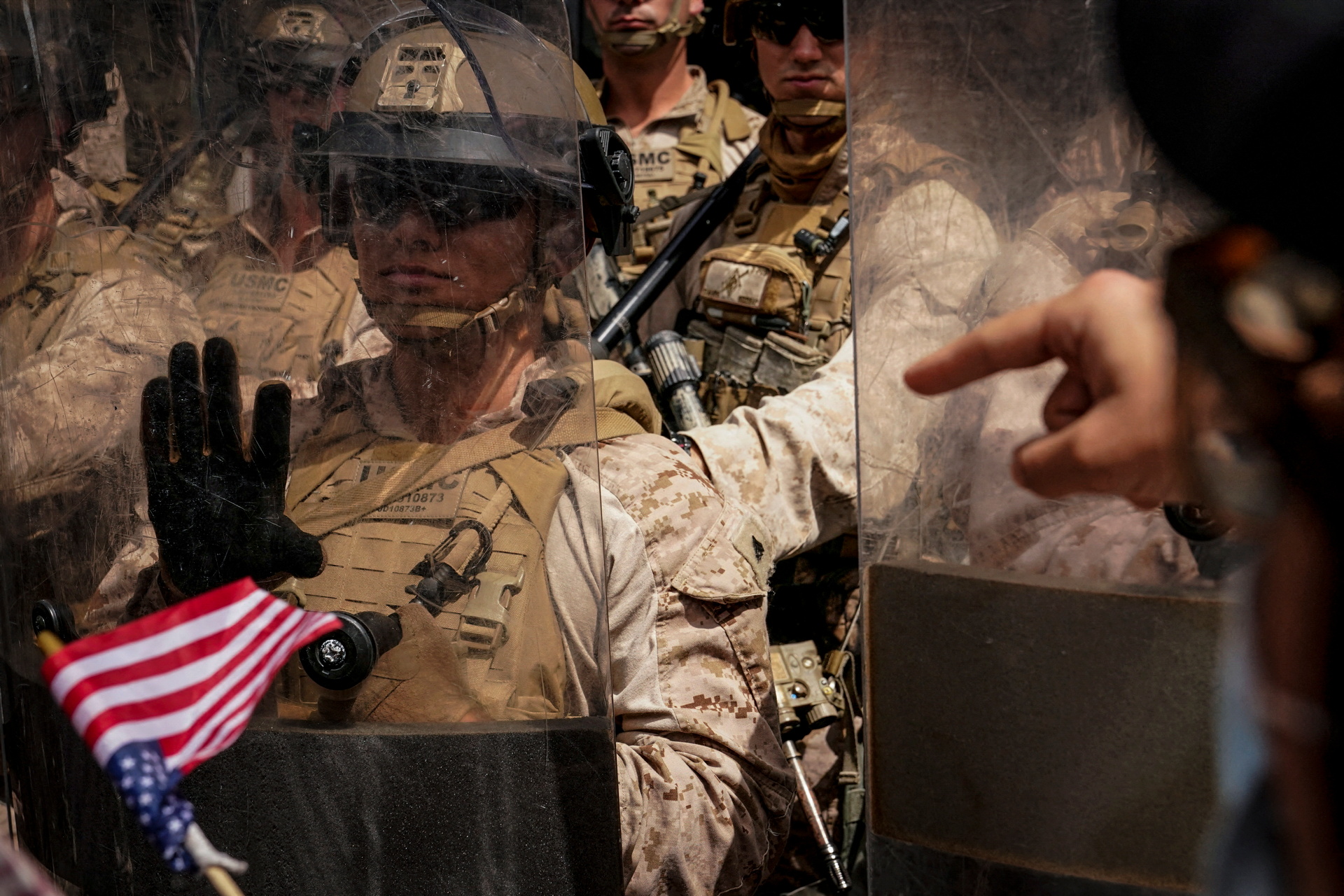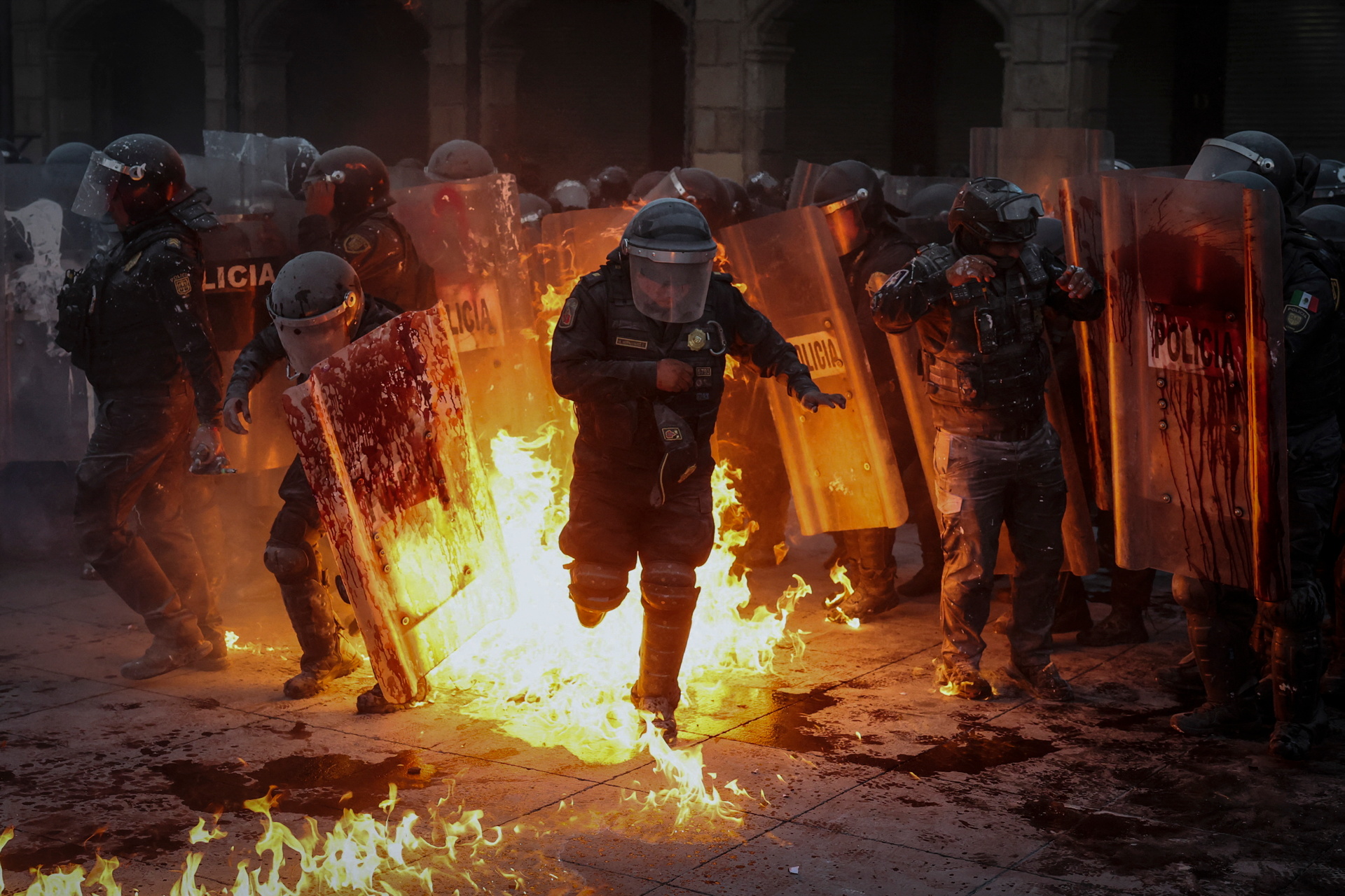 1968 оны Тлателолкогийн талбайн аллагын 57 жилийн ойг дурсах жагсаалын үеэр жагсагчид болон цагдаа нар мөргөлдөв. Гал дундаас зугтаж буй цагдаа нар, 2025 оны 10-р сарын 2. REUTERS/Henry Romero