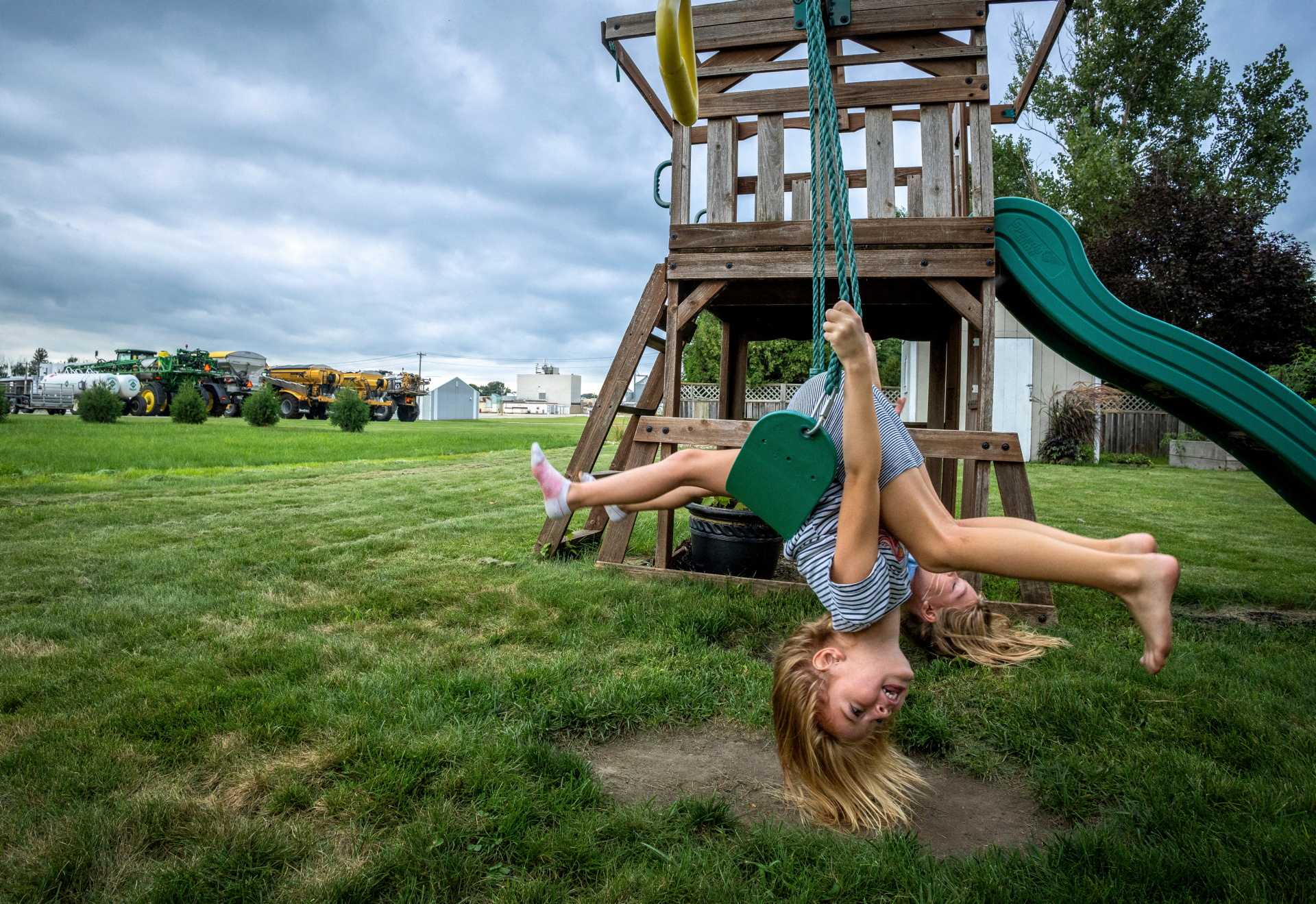 Орон нутгийн фермийн газартай залгаа арын хашаандаа савлуур дээр тоглож буй таван настай Мила, долоон настай Ханна Вендланд нар, 2025 оны 8-р сарын 21. REUTERS/Evelyn Hockstein