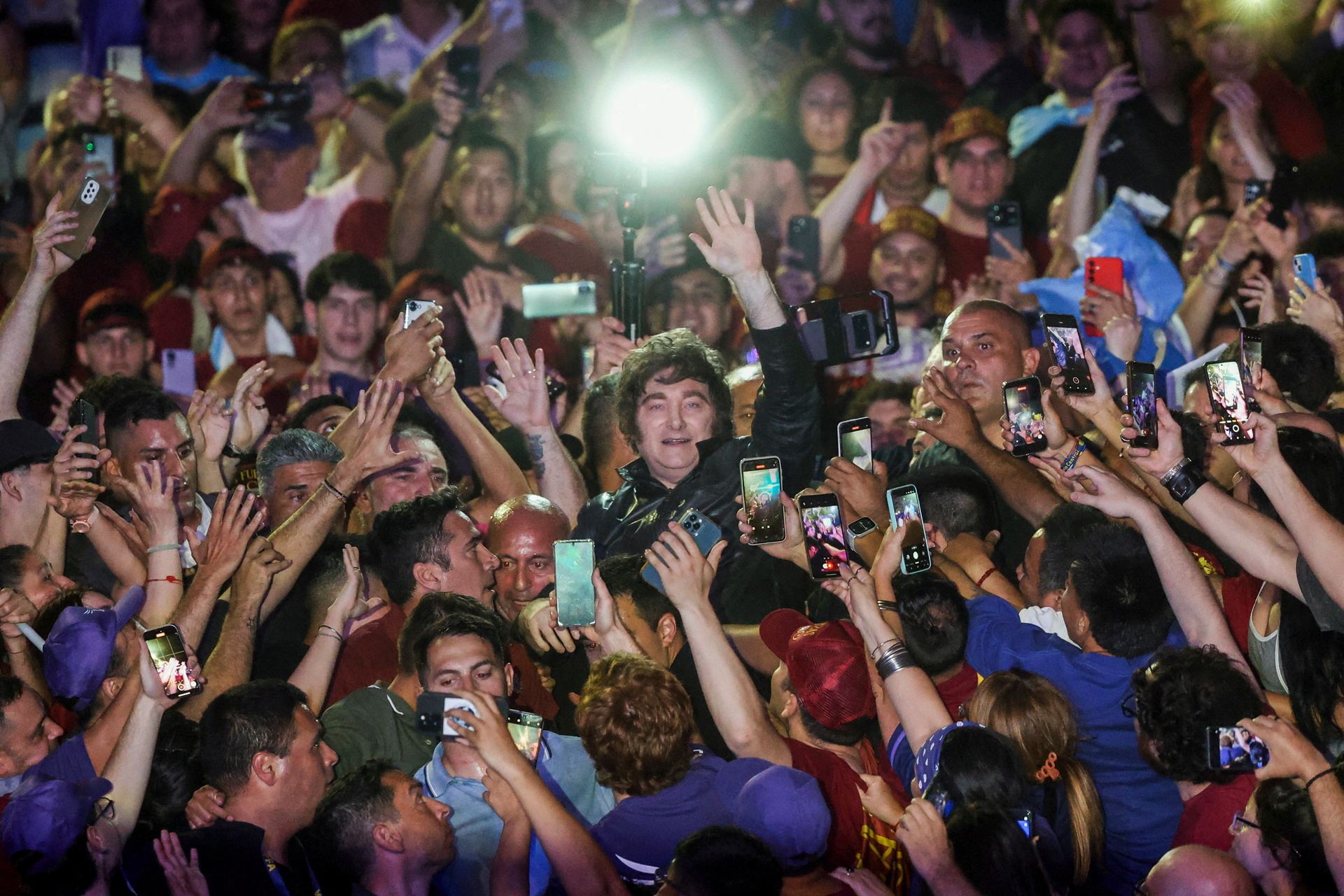 2025 оны 10-р сарын 26-нд болох завсрын сонгуулийн өмнөхөн болсон “Ла Либертад Аванса” намын хаалтын цуглаанд оролцож, олны зүг даллаж буй Аргентины Ерөнхийлөгч Хавьер Милей. 2025 оны 10-р сарын 23. REUTERS/Cristina Sille