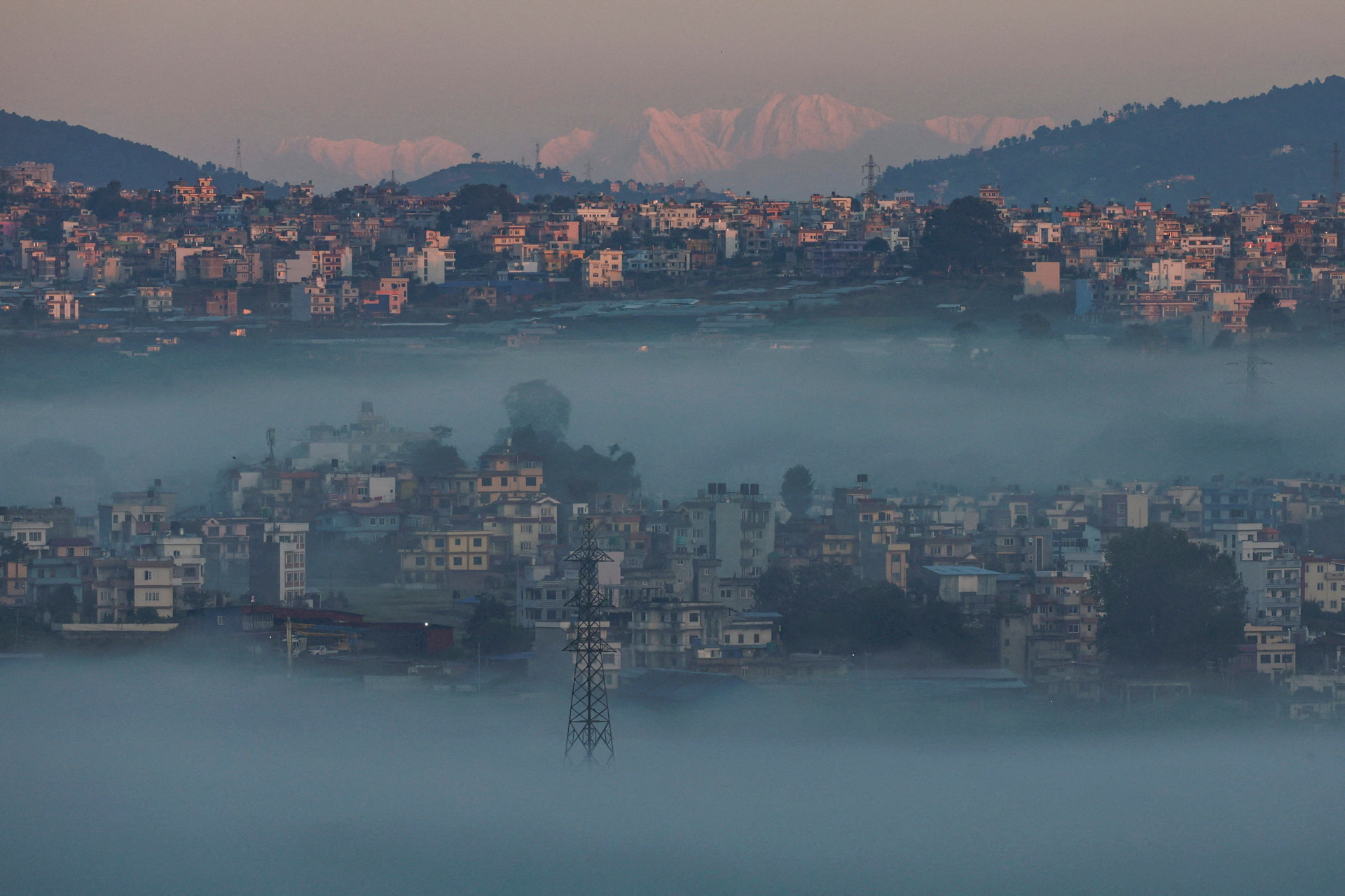 Манантай өглөөний үеэр хөндий дээгүүр цасан бүрхүүлтэй уулсын нуруу тодрон харагдаж буй нь, Балбын Катманду хотод, 2025 оны 10-р сарын 11. REUTERS/Navesh Chitrakar