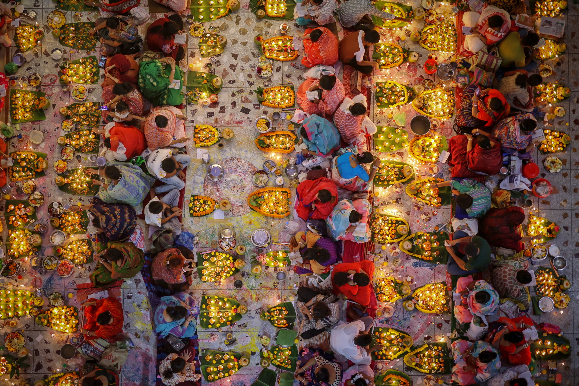 Ракхер Упобаш баярын үеэр Хинду шашны сүсэгтнүүд гэгээнтэн, гүн ухаантан Локенат Брахмачарид залбирахаар тосон дэнлүү барин хамтдаа сууж буй хиндү сүсэгтнүүд, 2025 оны 11-р сарын 4. REUTERS/Mohammad Ponir Hossain