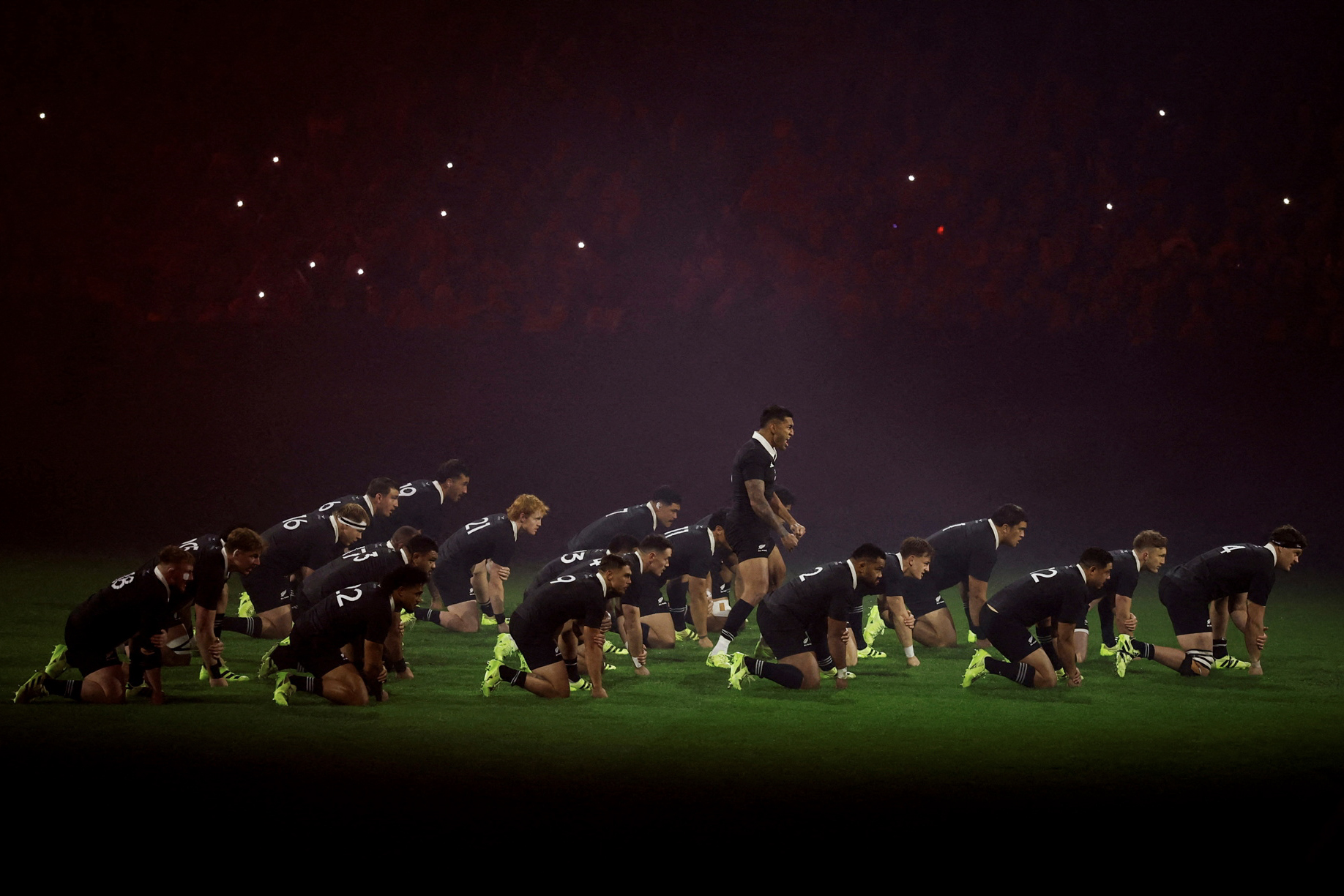 Намрын олон улсын тэмцээний хүрээнд Уэльстэй хийх тоглолтын өмнө Кардифф хотын Принсипалити цэнгэлдэх хүрээлэнд хакa бүжгийг үзүүлж буй Шинэ Зеландын регбийн шигшээ багийн тоглогчид, 2025 оны 11-р сарын 22. REUTERS/Andrew Couldridge
