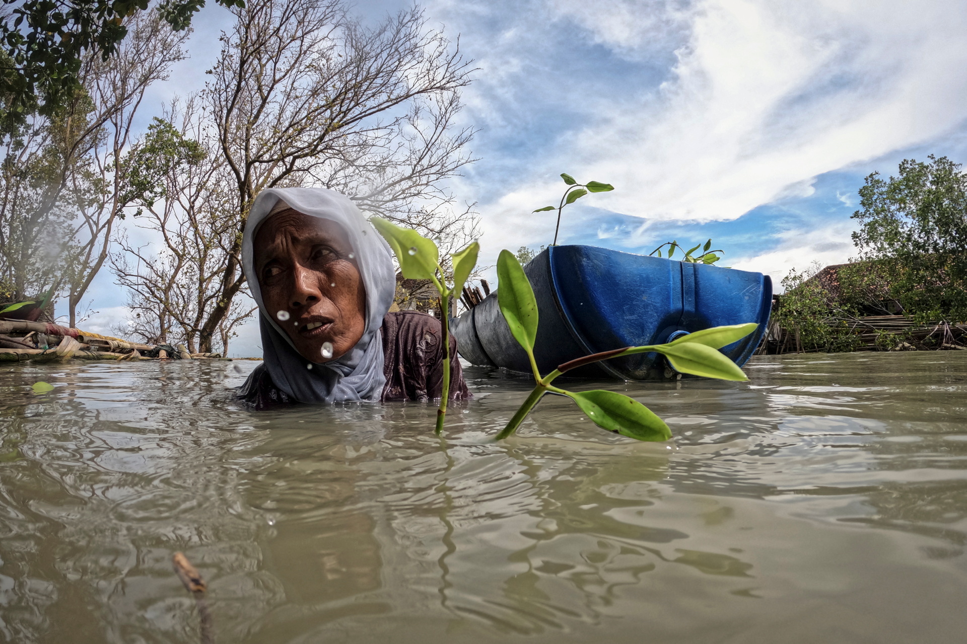 Индонезийн Төв Жава муж, Демак бүс нутаг. Усанд автсан Режосари Сеник тосгонд 55 настай Пасия мангров модны суулгац тарьж байна. 2025 оны 2 сарын 19. REUTERS/Ajeng Dinar Ulfiana