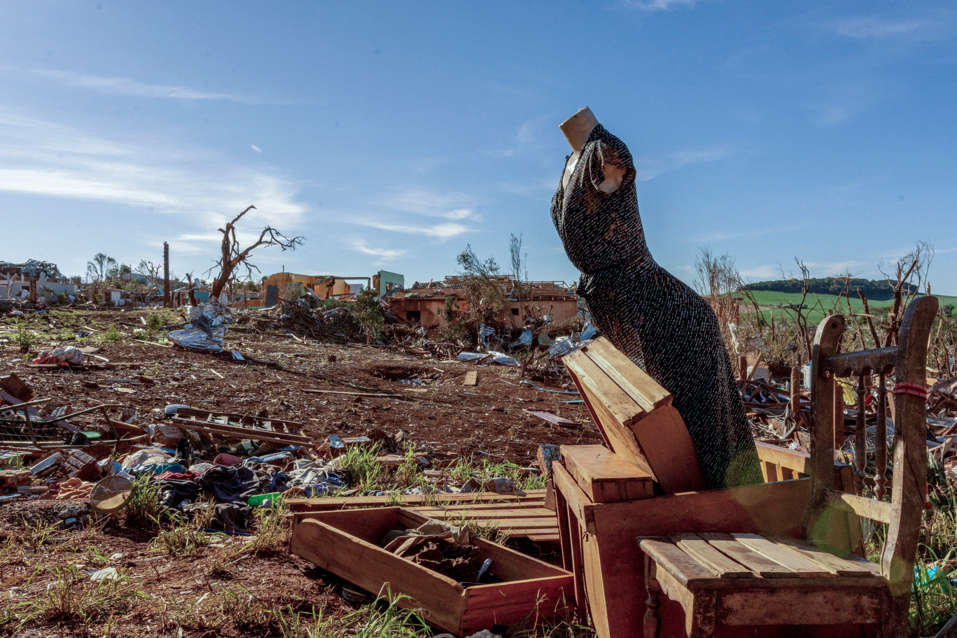Бразилийн өмнөд хэсгийн Парана мужийн Рио Бонито ду Игуасу хотод хар салхи дайрсны дараа эвдэрсэн бүсэд манекений ойролцоо тархсан хог хаягдал, 2025 оны 11-р сарын 9. REUTERS/Priscila Ribeiro