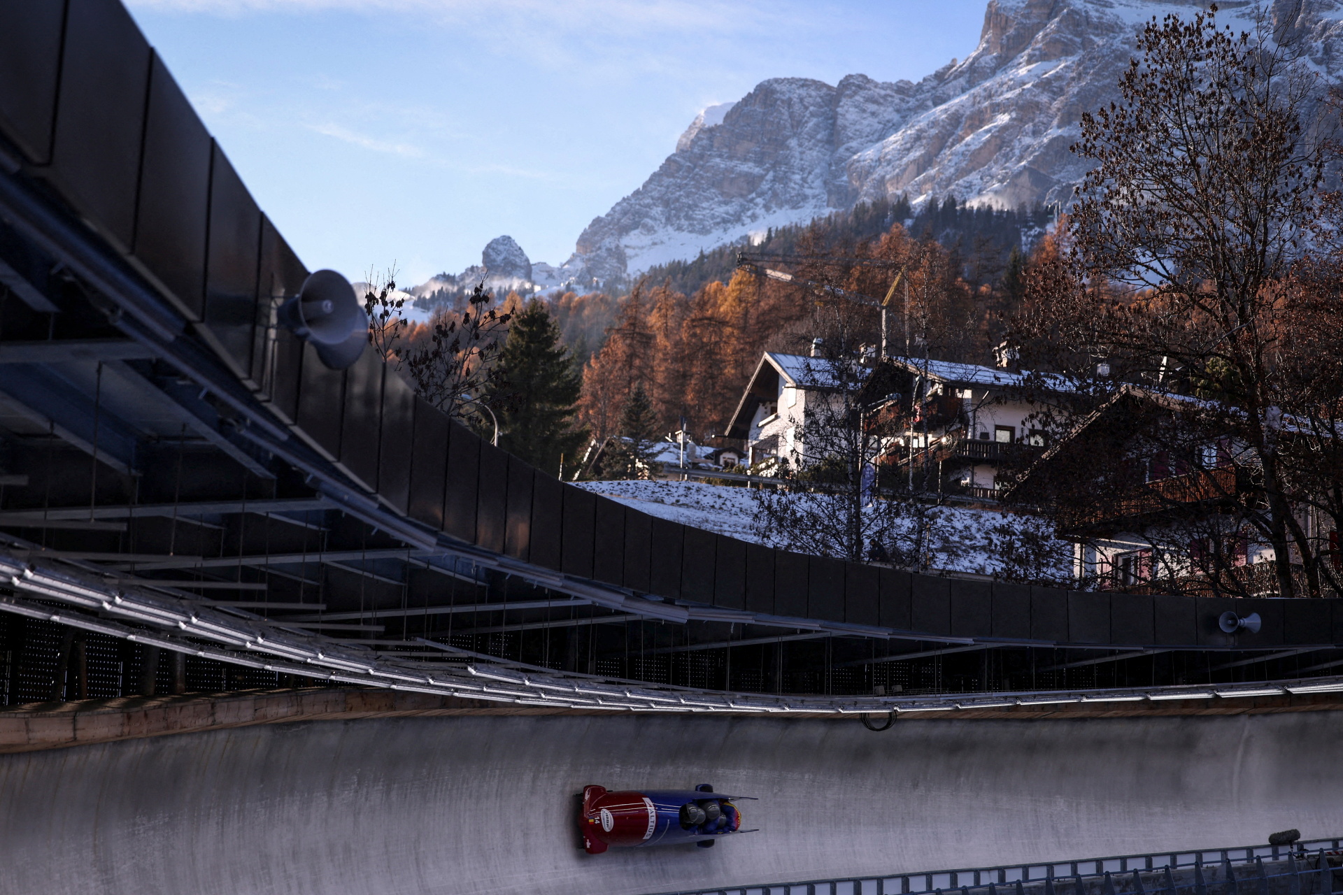 IBSF-ийн Дэлхийн цомын туршилтын тэмцээний үеэр Кортина д’Ампеццо дахь гулсуурын төвд зохион байгуулагдсан дөрвөн хүний бобслейн хоёрдугаар гараанд Румыны тамирчид Михай Кристиан Тентеа, Константин Динеску, Михай Даниел Пачиояну, Андрей Ника нар уралдаж буй нь, 2025 оны 11-р сарын 23. REUTERS/Claudia Greco