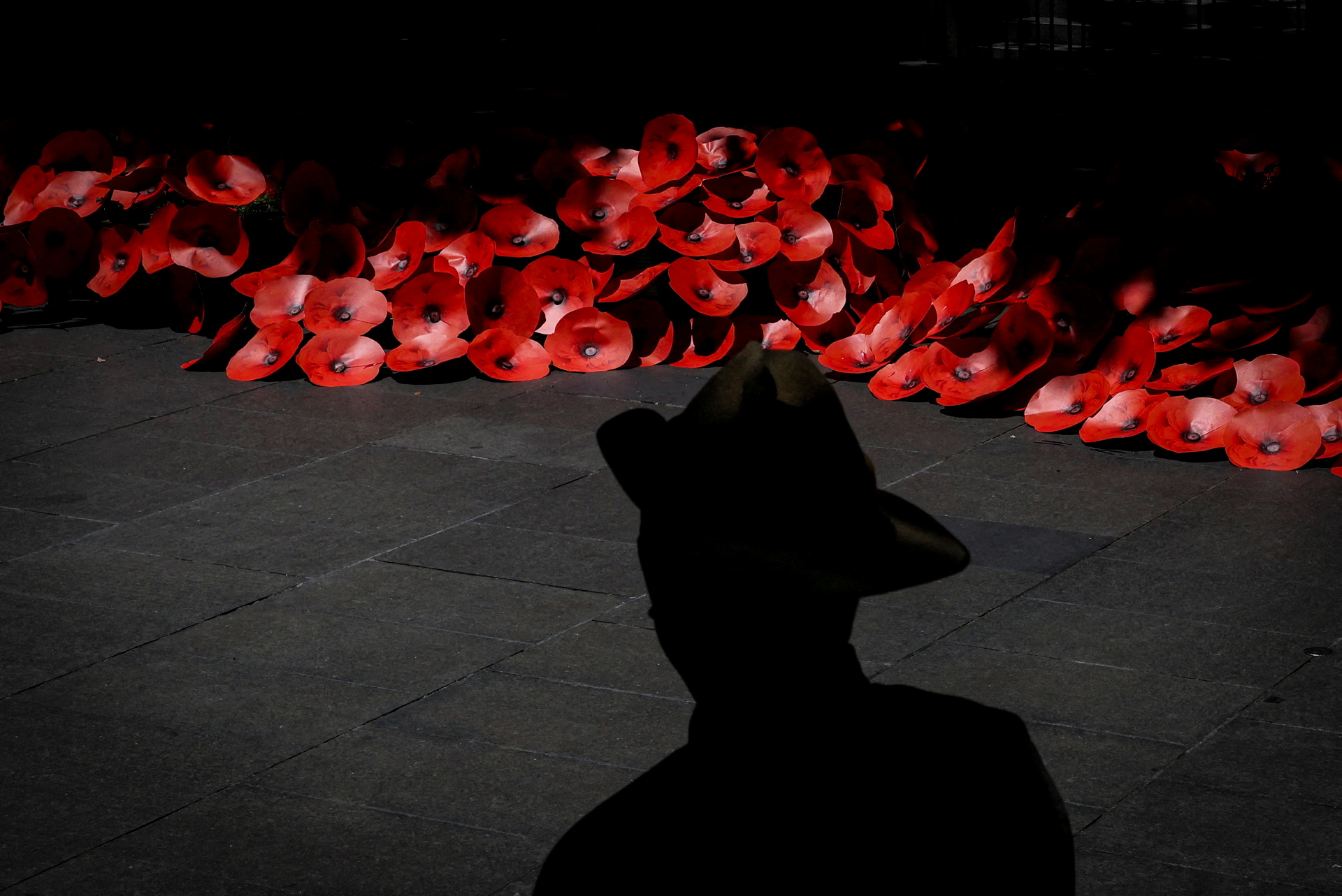 Дурсгалын өдрийн ёслолын үеэр Сидней хотын Мартин Плэйст байрлуулсан улаан Фландерс намуу цэцгийн картон чимэглэлийн дундуур, уламжлалт slouch малгай өмсөн алхаж буй эрэгтэй, 2025 оны 11-р сарын 11. REUTERS/Hollie Adams
