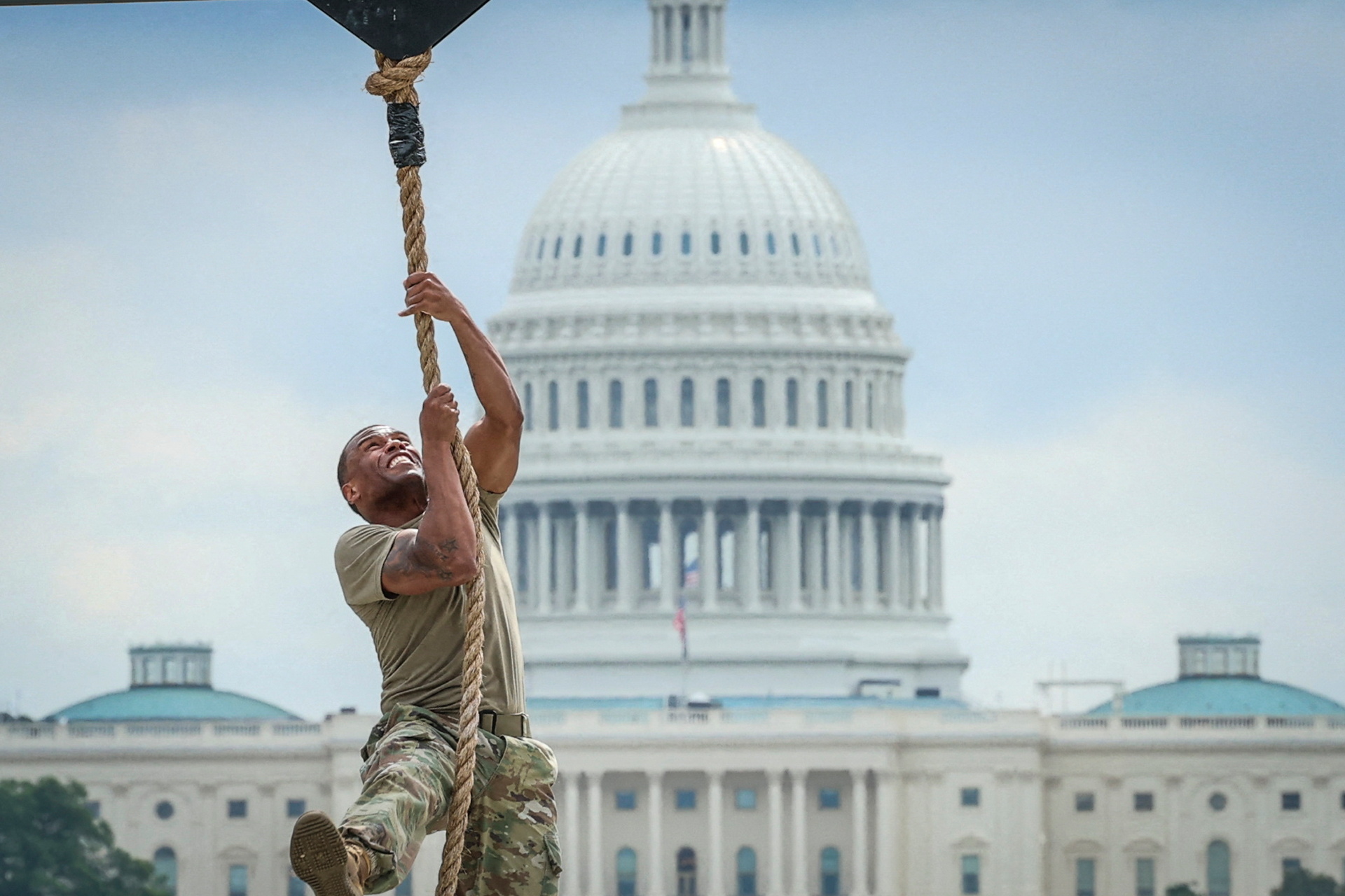Жил бүр Хэллоуины өмнө зохион байгуулагддаг өндөр өсгийттэй гүйлтийн уралдааны үеэр барианд орж буй оролцогчид, АНУ-ын Вашингтон хотод, 2025 оны 10-р сарын 28. REUTERS/Nathan Howard