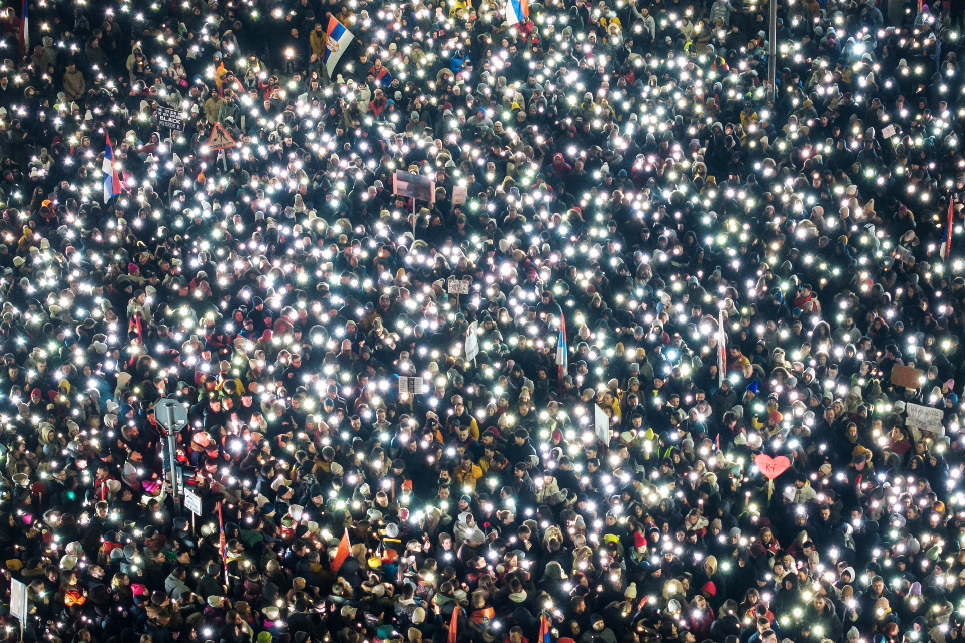 2024 оны 11-р сард Нови Сад хотын төмөр замын вокзалын дээвэр нурсны улмаас амь үрэгдэгсдийн дурсгалыг хүндэтгэн жагсагчид 15 минут дуугүй зогсож буйг дроноор буулгасан дүр зураг.2 2025 оны 2 сарын 15. REUTERS/Marko Djurica