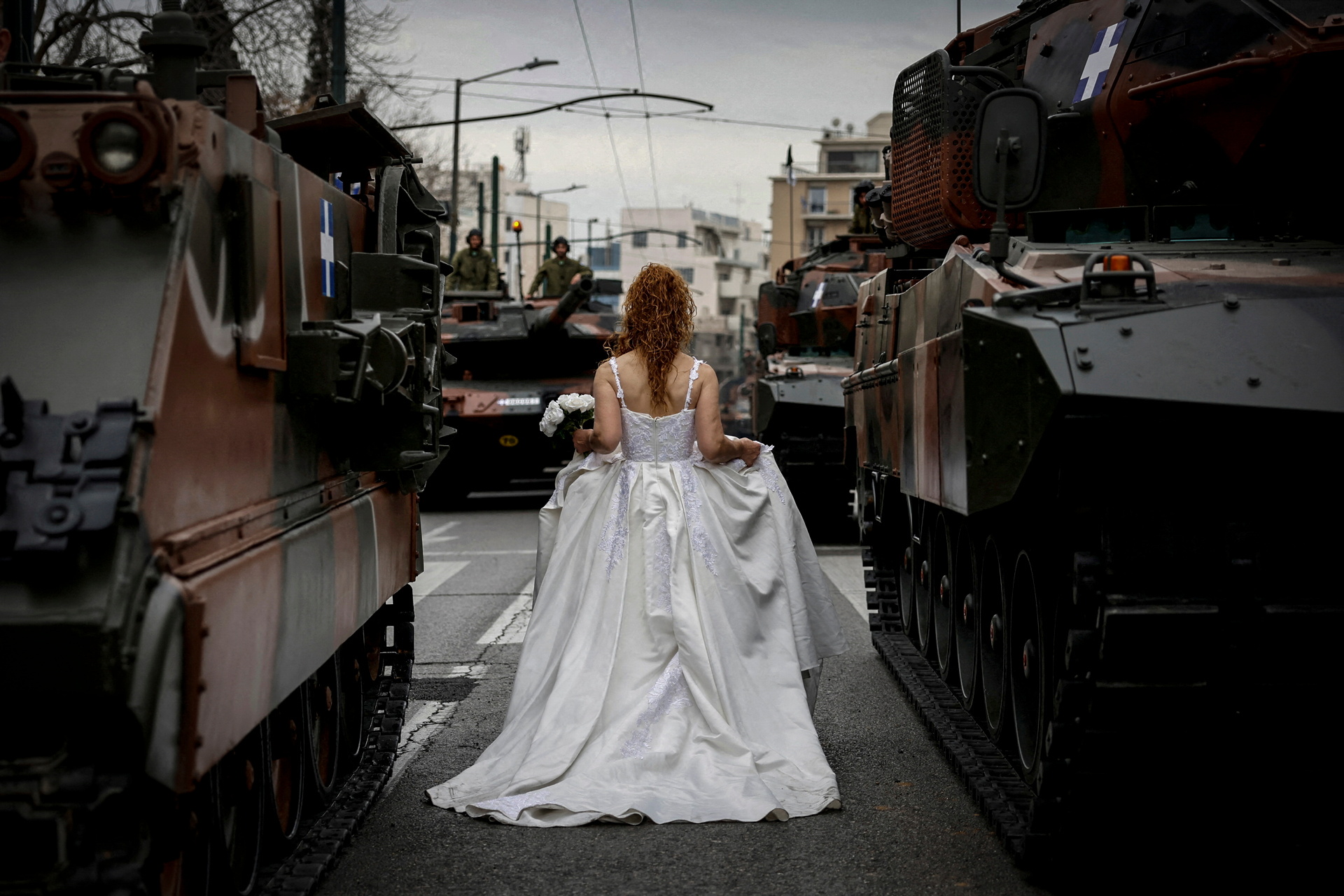 Грекийн тусгаар тогтнолын өдөрт зориулсан цэргийн парадын өмнө нэгэн сүйт бүсгүй Грекийн хуурай замын цэргийн техникүүдийн хажуугаар алхаж төлөвлөсөн гэрэл зураг авалтад орж буй нь. 2025 оны 3 сарын 25. REUTERS/Louiza Vradi