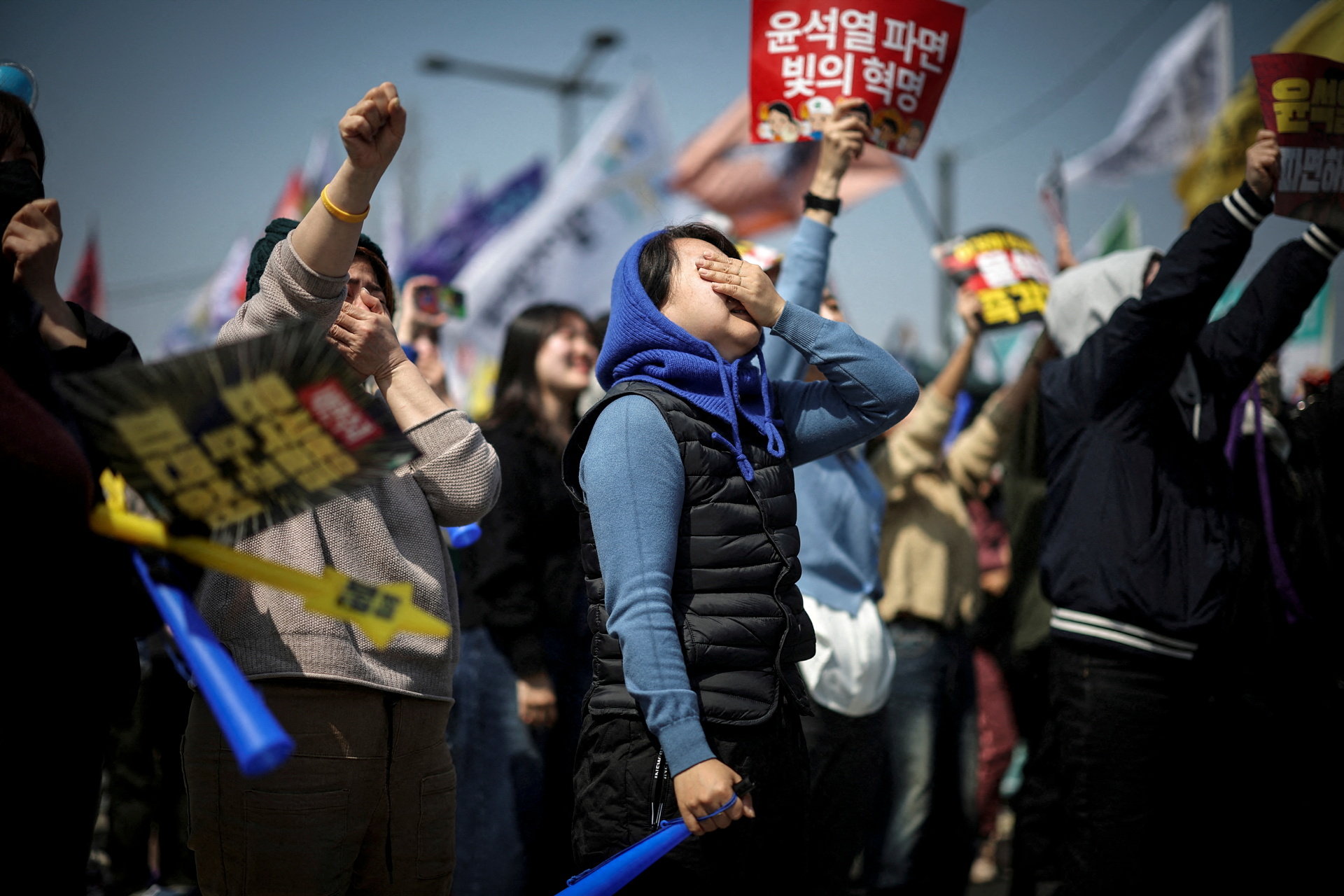 Ерөнхийлөгч Юн Сүк Ёлыг албан тушаалаас нь огцруулах (импичмент) шийдвэрийг Үндсэн хуулийн цэц хүлээн зөвшөөрсний дараа хүмүүс цэцийн ордны гадна баярлаж байгаа нь. 2025 оны 4 сарын 4. REUTERS/Kim Hong-ji