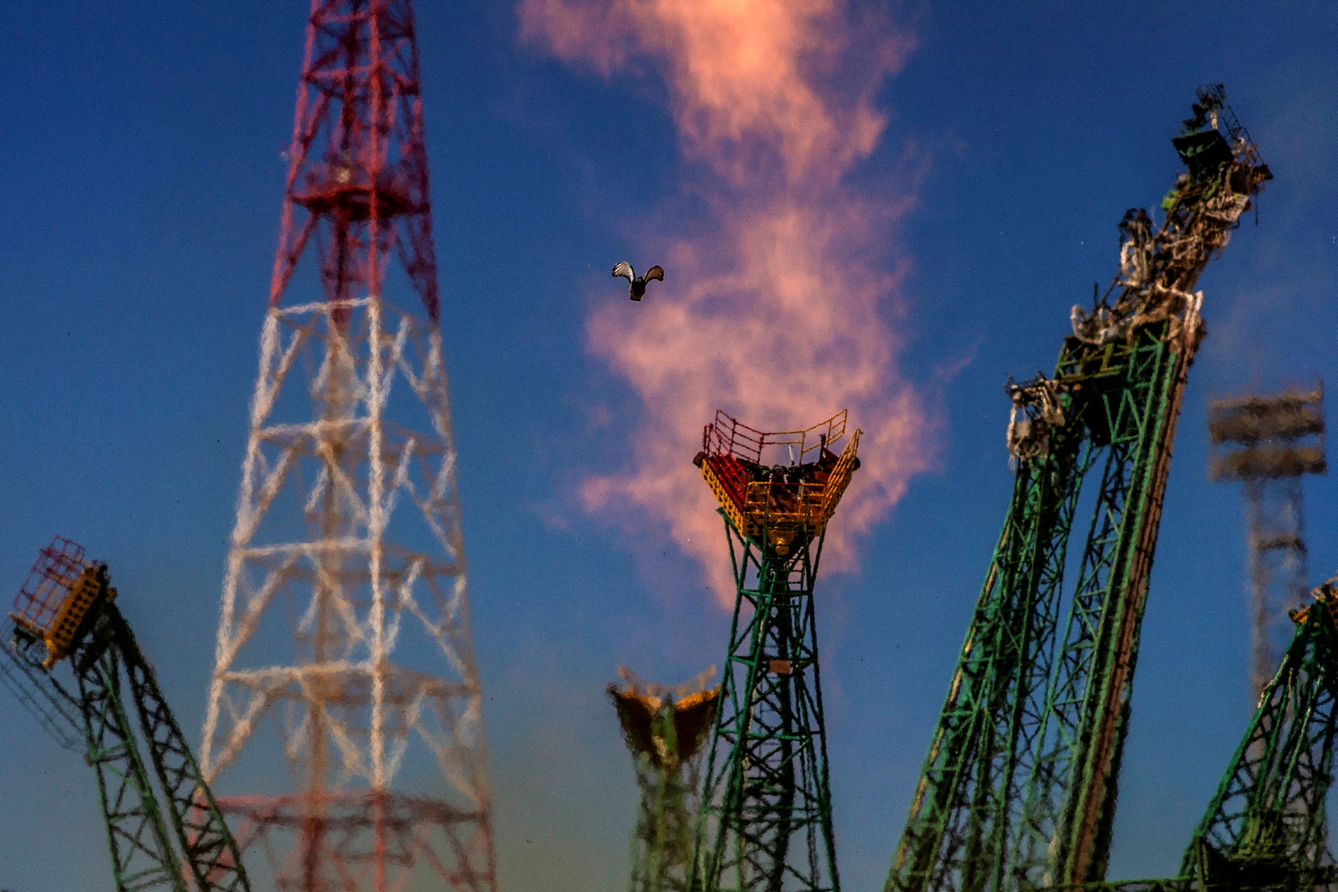 НАСА-гийн сансрын нисэгч Жонни Ким, Роскосмосын сансрын нисэгчид Сергей Рыжиков, Алексей Зубрицкий нарын бүрэлдэхүүнтэй “Союз МС-27” хөлөг Казахстаны Байконурын сансрын буудлаас Олон улсын сансрын станц (ISS)-руу хөөрөх агшинд нэгэн шувуу нисэн өнгөрч байна. 2025 оны 4 сарын 8. REUTERS/Maxim Shemetov