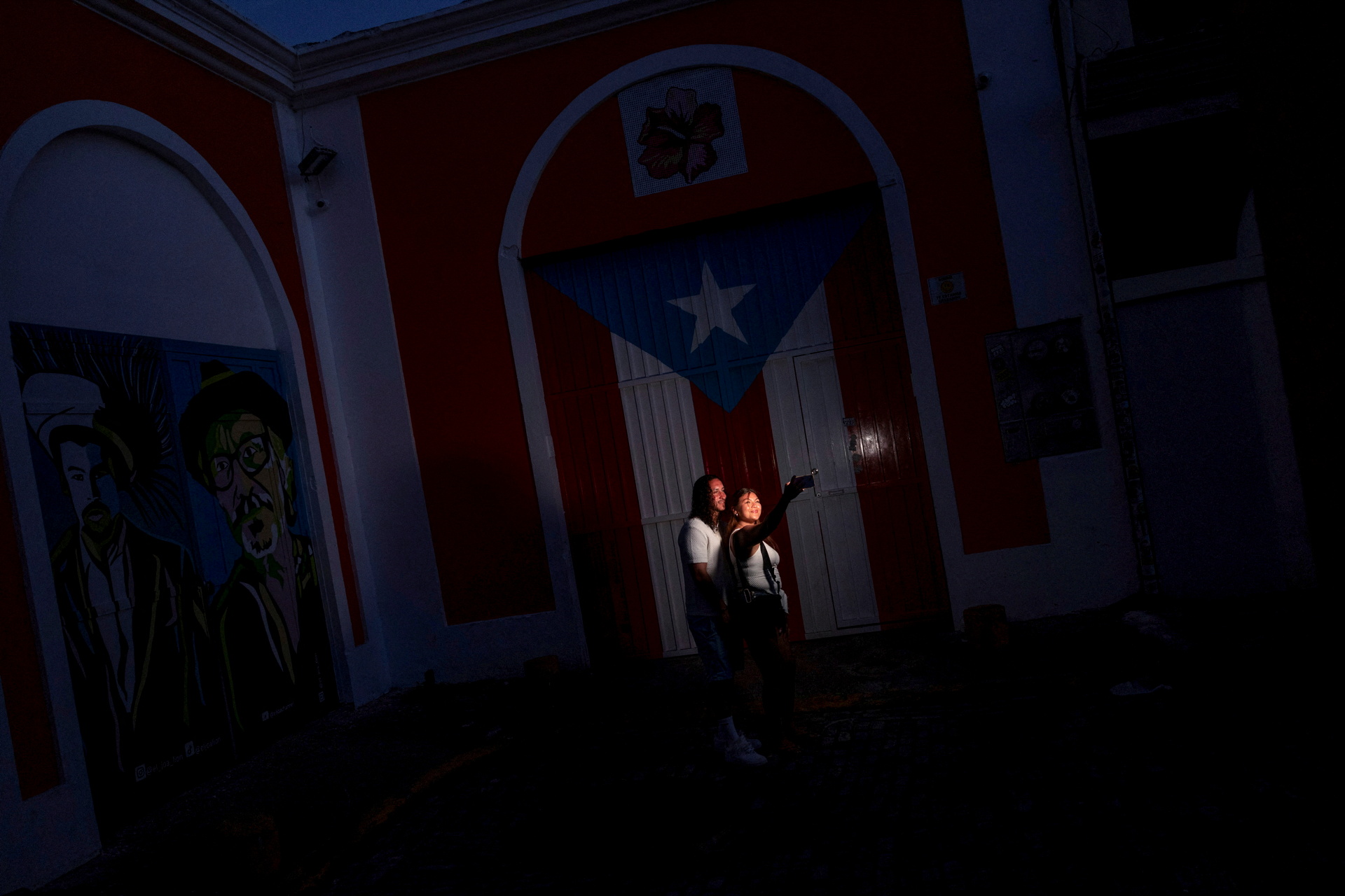 Арлын бүх цахилгаан станцууд гэнэт зогссоноос болсон эрчим хүчний томоохон тасалдлын дараа Пуэрто-Рикогийн төрийн далбааны өмнө өөрийн зургаа (selfie) авч байгаа нэгэн хос. 2025 оны 4 сарын 16. REUTERS/Ricardo Arduengo