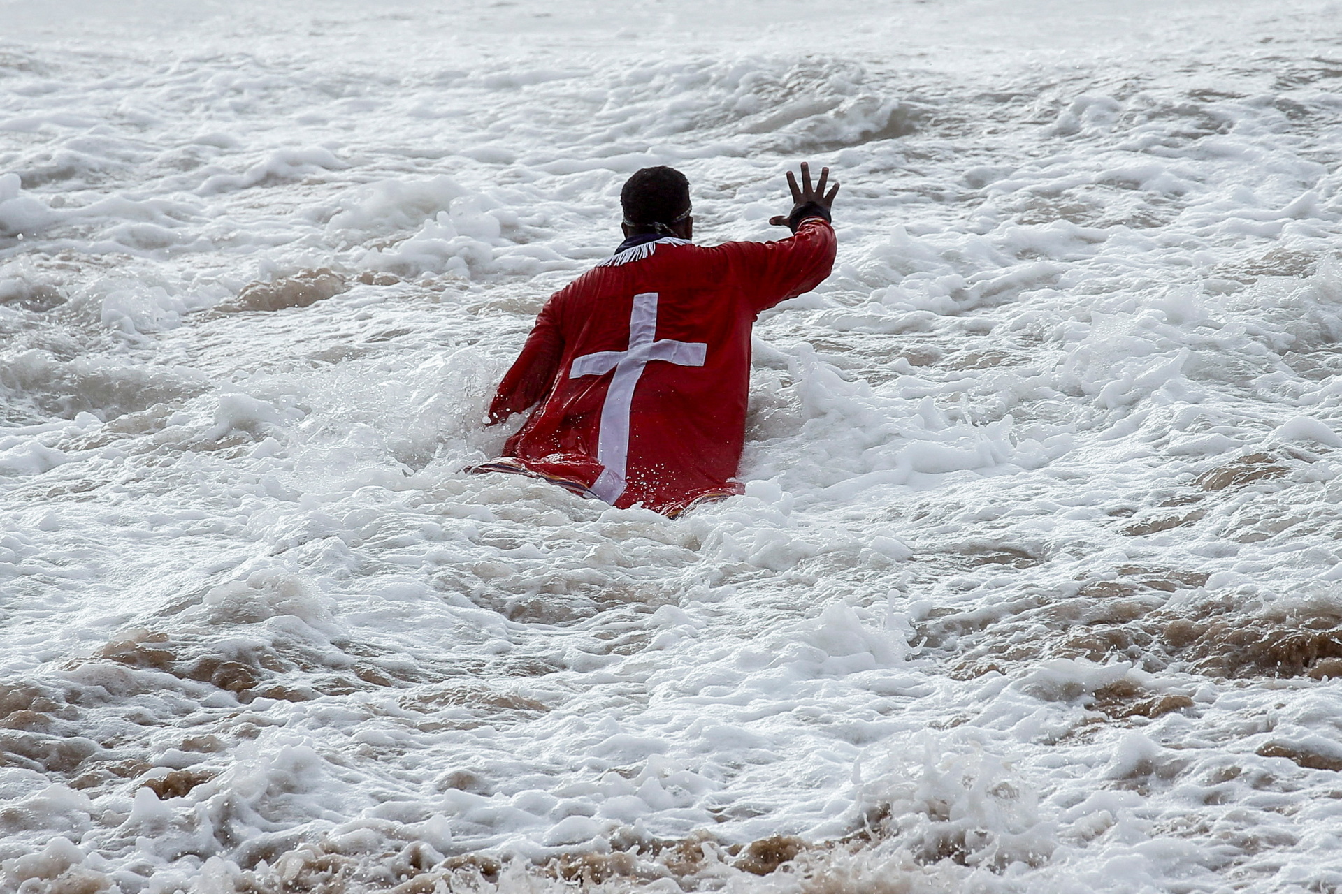 Өмнөд Африкийн Дурбан хотын далайн эрэг дээр болсон Сайн Баасан гарагийн баптисмын ёслолын үеэр сүмийн ахлагч усанд зогсон залбирч байна. 2025 оны 4 сарын 18. REUTERS/Rogan Ward