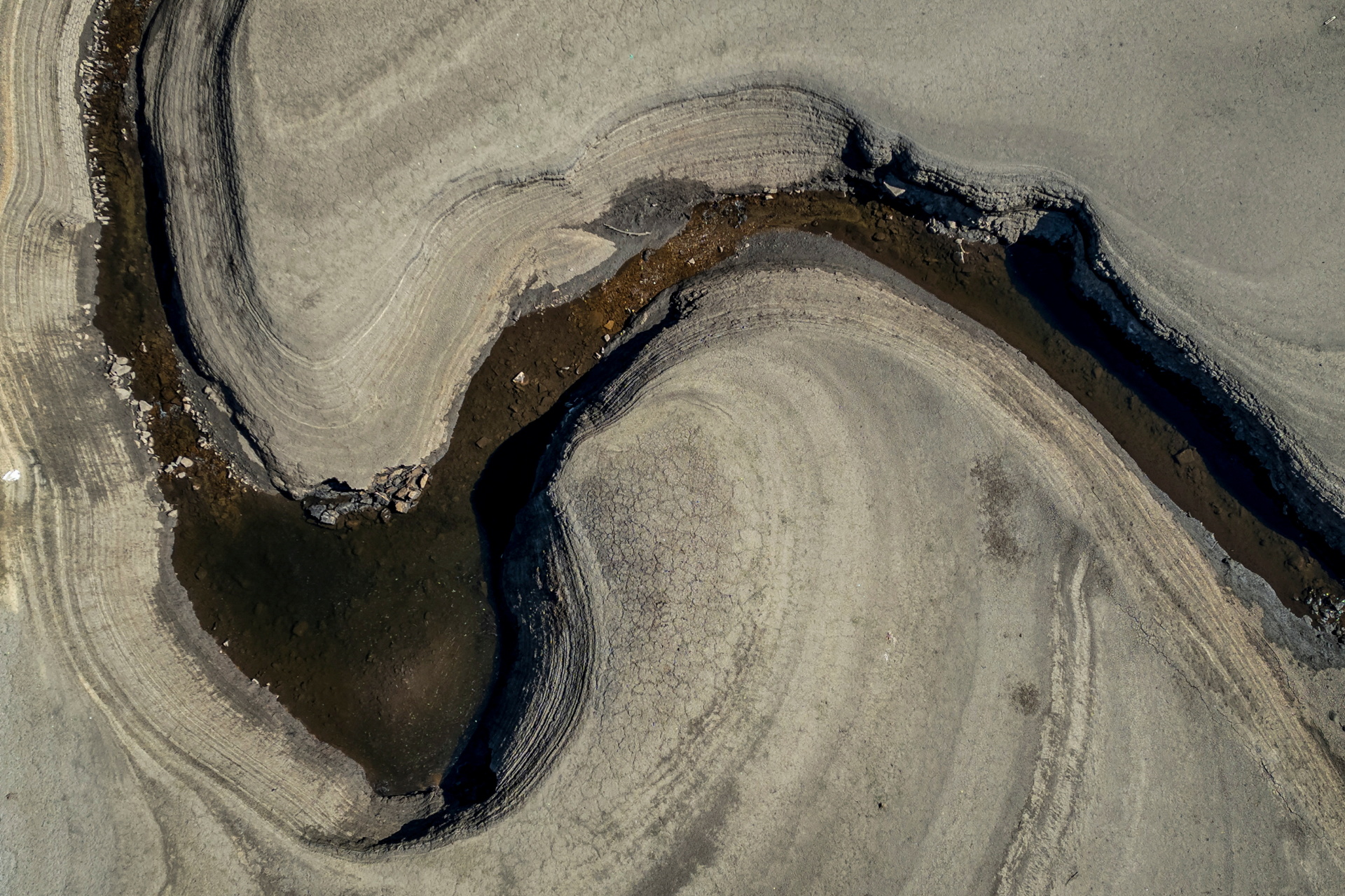 Удаан хугацаанд бороо ороогүйн улмаас усны түвшин эрс буурч, Вудхед усан сангийн хатсан хэсэг дундуур нарийн усны суваг урсаж буйг дроноор буулгасан дүр зураг. 2025 оны 5 сарын 13. REUTERS/Phil Noble
